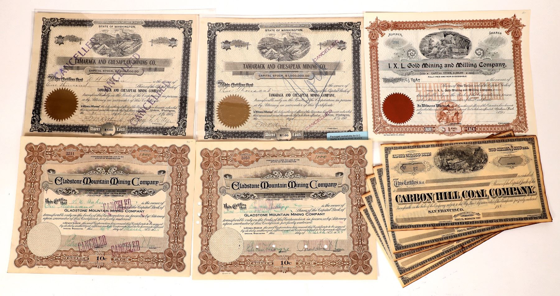 Lot of 11. Includes: Carbon Hill Coal Company (6 unissued stocks, Pierce County, 1880s); IXL Gold M&MC (unissued, Spokane); Gladstone Mountain MC (two stocks, 1925); and Tamarack & Chesapeak(sic.) Mining Company (2 stocks, 1908, mining vignettes, Spokane). Please inspect.