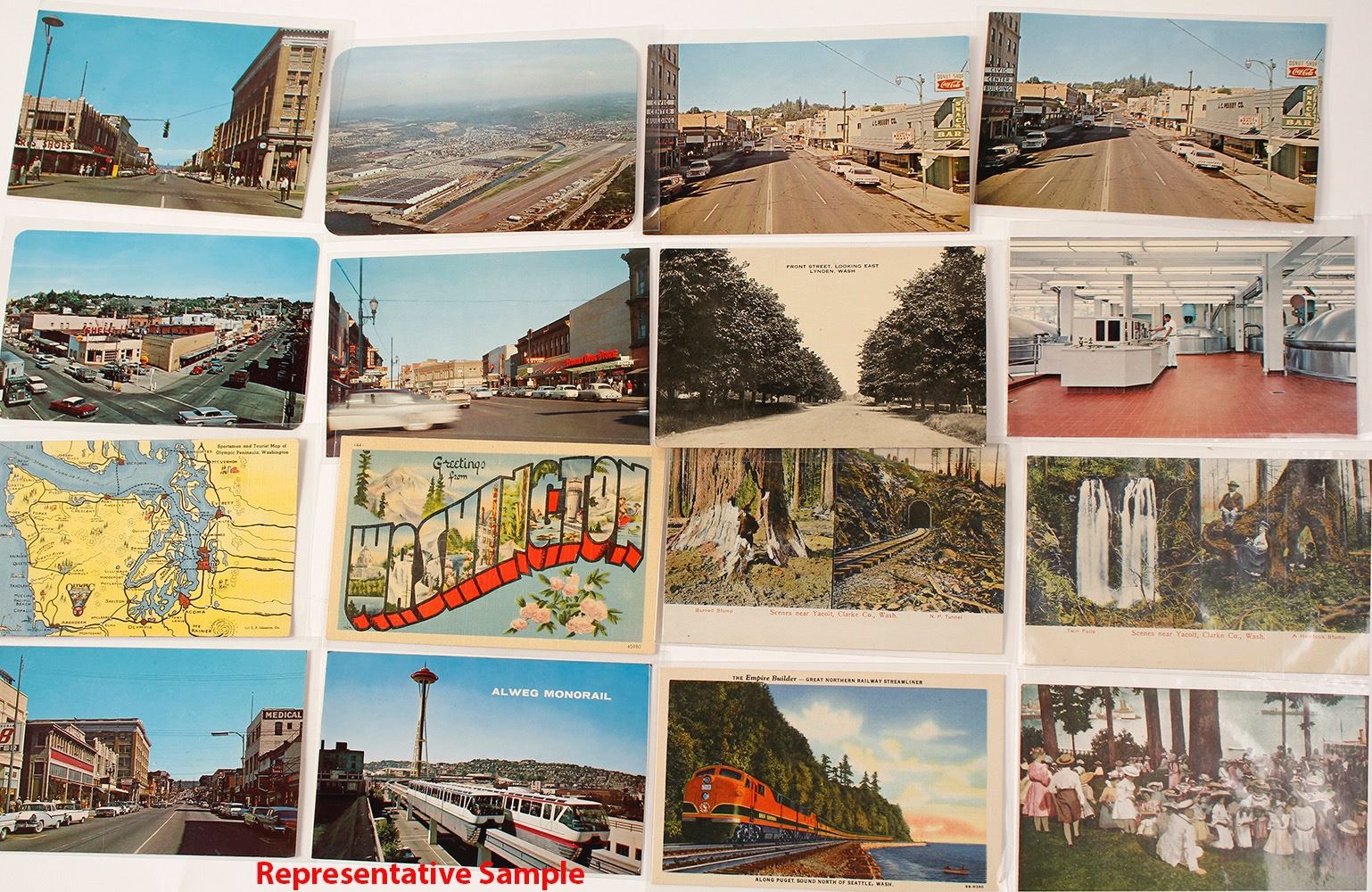 Lot of 70 plus including 31 real photo, a leather postcard, and a tax token. This is a diverse group of early and later cards from around the state with many street scenes. 1) RPCs: Washington Building at Pan.Pac; Gray's Harbor Electric Co. Plant; Castle Rock street scene, c.1920; Kent street scene; Pasco snow storm street scene; Cornwall Ave., Bellingham; The Dalles; City Hall in Everett; street scenes in Auburn, Mount Vernon, Pasco, Walla Walla; Stonehenge World War Memorial at Maryhill; city hall at Bellingham; courthouses in Prosser, Pomeroy, and Everett; fair at Puyallup; Magnasite Plant at Chewelah; and more. Plus a souvenir envelope of 16 miniature black-and-white photos of Pullman, 1.75 x 2.75". 2) Leather postcard with Native American swastika mailed from Hoquiam, Washington (date unreadable). 3) State of Washington Tax Token, aluminum. 4) Remainder of postcards include modern and early printed. Counting all the postcards (incl RPC), 23 were mailed, 1907-1977. Please inspect. (Prag Collection) Date: Location: Washington HWAC# 55476