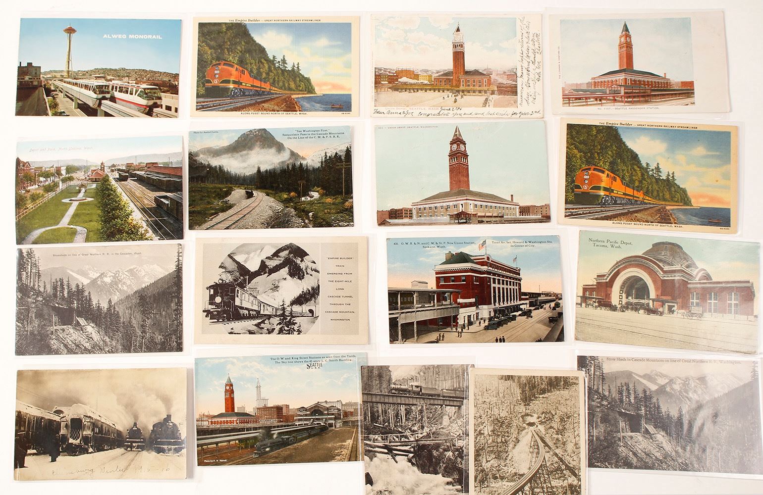 Lot of 17 including one rare real photo. The RPC is a dramatic view of locomotives waiting on a snowy track with "Ellensburg, Winter 1915-16" written in pen at the bottom. Other cards are mostly early printed and include: Seattle O-W and King Street stations; two different Union Depot at Seattle (mailed 1906 & 1908); Seattle Passenger Station; Depot and Park at North Yakima; Snoquaimie Pass (mailed 1916); two of Snowsheds on line of Great Northern RR in Cascades (one mailed 1908); Empire Builder train emerging from Cascade Tunnel; New Union Station, Spokane; Horse Shoe Tunnel (mailed 1924); Northern Pacific Depot at Tacoma; train crossing bridge over Deception Creek (mailed 1908); and 3 more modern cards. (Prag Collection) Date: Location: Washington HWAC# 55455