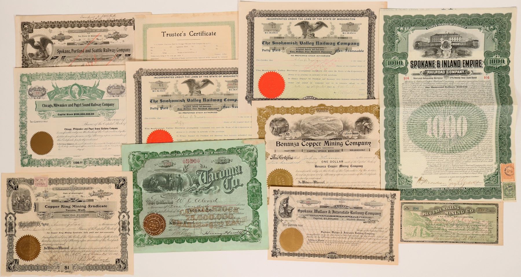 1. Washington Mining Stock Certificates - 1) Pico Free-Milling & Mining Company. Issued in 1904, not cancelled. Made to look like currency! Vignette in the background on miners and Lake Kitchelos. 2) Tacoma Company. Issued in 1903, not cancelled. Black print on green paper with ornate border and multiple mining vignettes. 3) Bonanza Copper Mining Company. Issued in 1921, not cancelled. Gold border and seal, black print, and three mining vignettes. 4) Copper King Mining Syndicate. Issued in 1901, not cancelled. Multiple mining vignettes. 2. 1) Three pieces are for the Snohomish Valley Railway Company. Includes two issued stocks (1907 and 1908), plus a Certificate of Trust for $500 (1906). The stocks have a black border and print, red seal, green background, and eagle vignette. 2) Chicago, Milwaukee and Puget Sound Railway Company. One stock, unissued. 190_. Green border, black print, gold seal, and vignette of George Washington. 3. Spokane & Inland Empire Railroad Company Bond - $1,000 bond No. 104, issued in 1906. Signed by president Jay Graves and secretary Davidson. Not cancelled. Green border, black print, and nice vignette showing multiple electric street cars. 4. 1) Spokane, Portland and Seattle Railway Company. Inc. in Washington. No. 81, issued for one share to FV Brown on April 3rd, 1920. Signed by the president and secretary. Pencil cancelled. Black border and print, gold seal, and eagle vignette. 2) Spokane, Wallace, & Interstate Railway Company. Inc. in Idaho. Unissued. Black border and print, gold seal, and allegorical vignette.