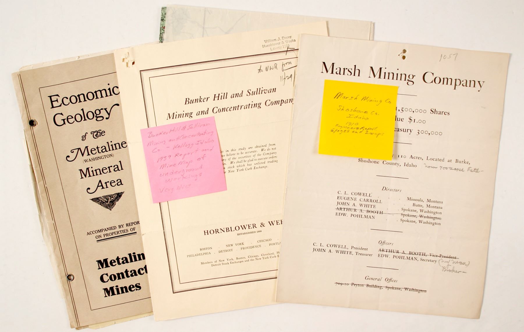 3. Metaline Contact Mines, Pend Oreille County, Washington 9 page report dated Oct 4, 1928 prepared by J.H. Ebby Mining Engineer and Geologist with four drawings of property locations and deposits. In good condition.