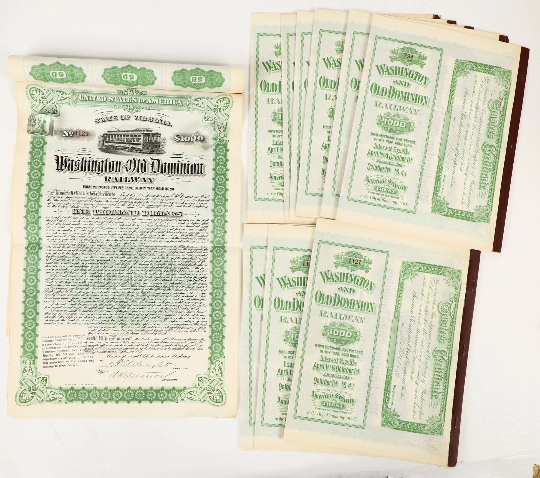 11 Washington and Old Dominion Railway $1000 gold bonds, green, all have at least one coupon removed, ~11pcs., 10.25 x 16 in., Secretary, A.K. Stratton; President, F.C Wright.