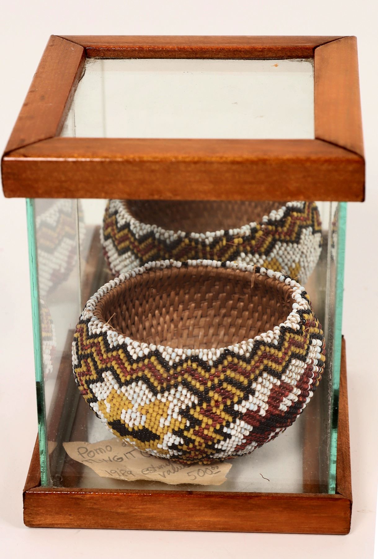 Choice Washoe beaded basket. Norm Delorme, our friend and sixth generation Washoe/Paiute basket weaver tells us this is a special basket. It has beadwork done by a separate person, not uncommon for beaded baskets. The beadwork is done by a left handed artist, possibly Celia Arnot, the only left handed beader of the c1930s period known to Delorme. The basket was started with a noninterlocking stitch and finished with an interlocking stitch, and has a one stick willow foundation. Very minor damage along the top edge. Small glass case included.