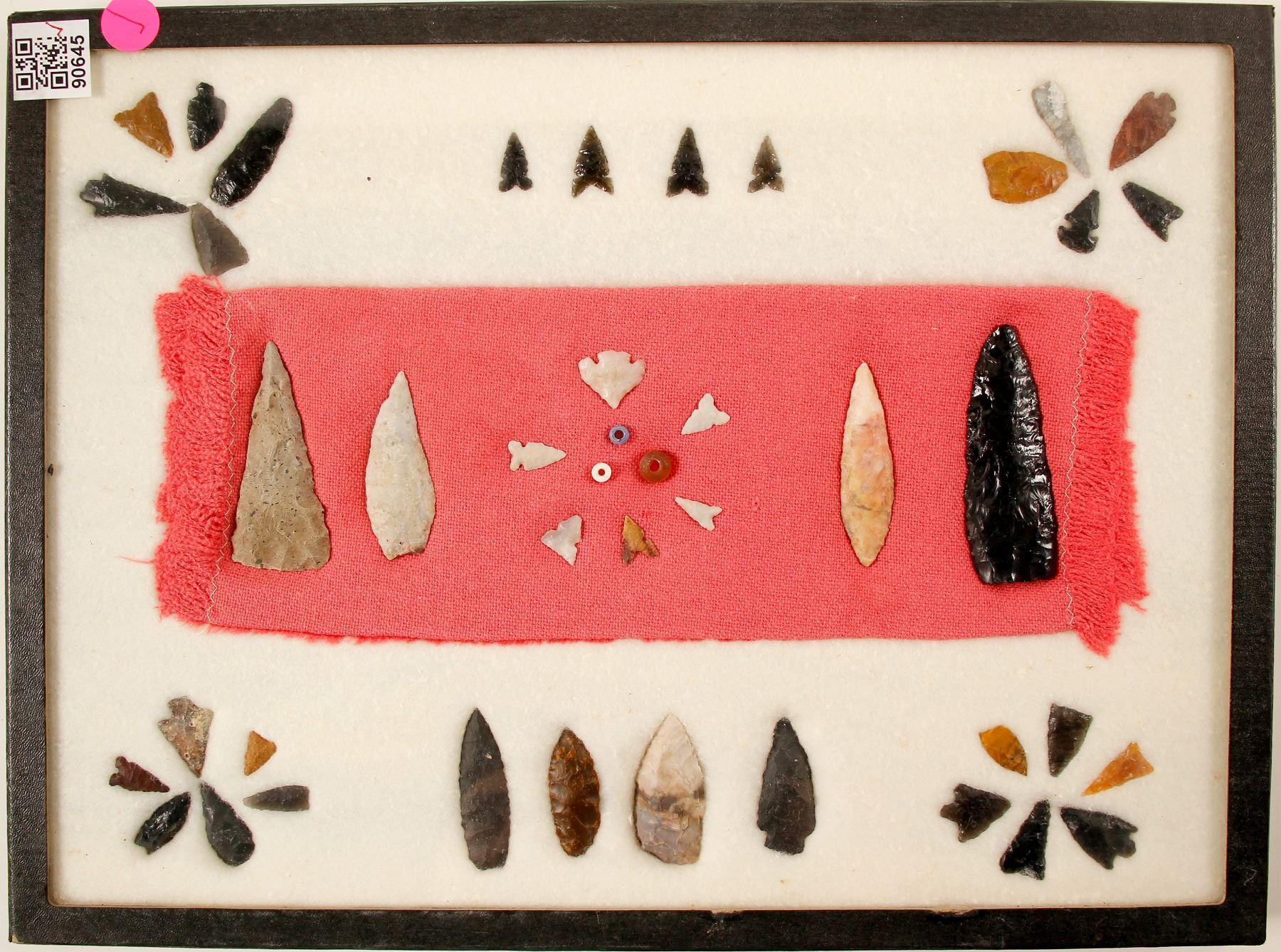 Obsidian, quartz, chert, carnelian, scrapers & drills, 3 trade beads in middle. Approx. 40 pieces. 1 obsidian Clovis point, 1 Haskett made from agate; several from the Gunther Series & a couple from Surprise Valley. Beautifully presented. From Northern Washoe County.