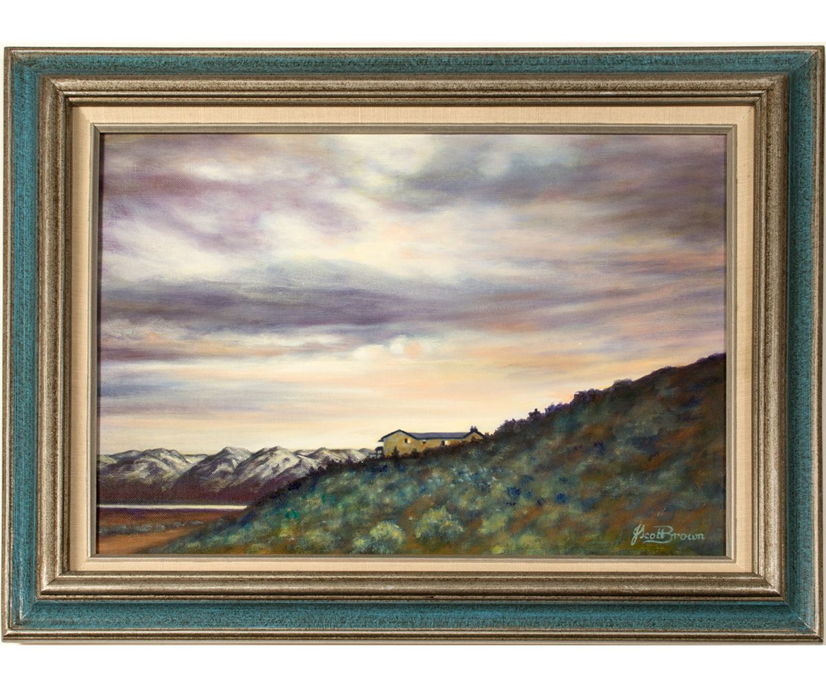Oil landscape painting by Joan Scott Brown. (framed size: 16" H x 20" W). View is from hillside, shows part of Washoe Lake, house, and mountains in the background.