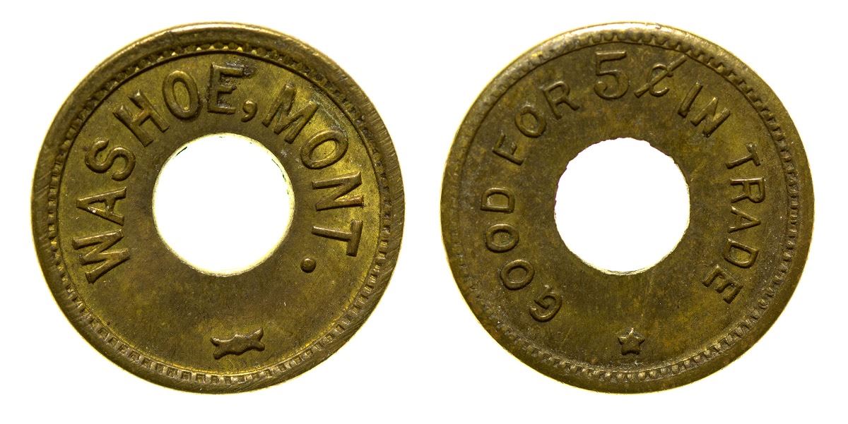 R-8. Washoe, Mont. // GF 5c IT. Brass, round, hole in center, 21mm. (Svoboda Collection) City: Washoe State: Montana Date: HWAC# 35043