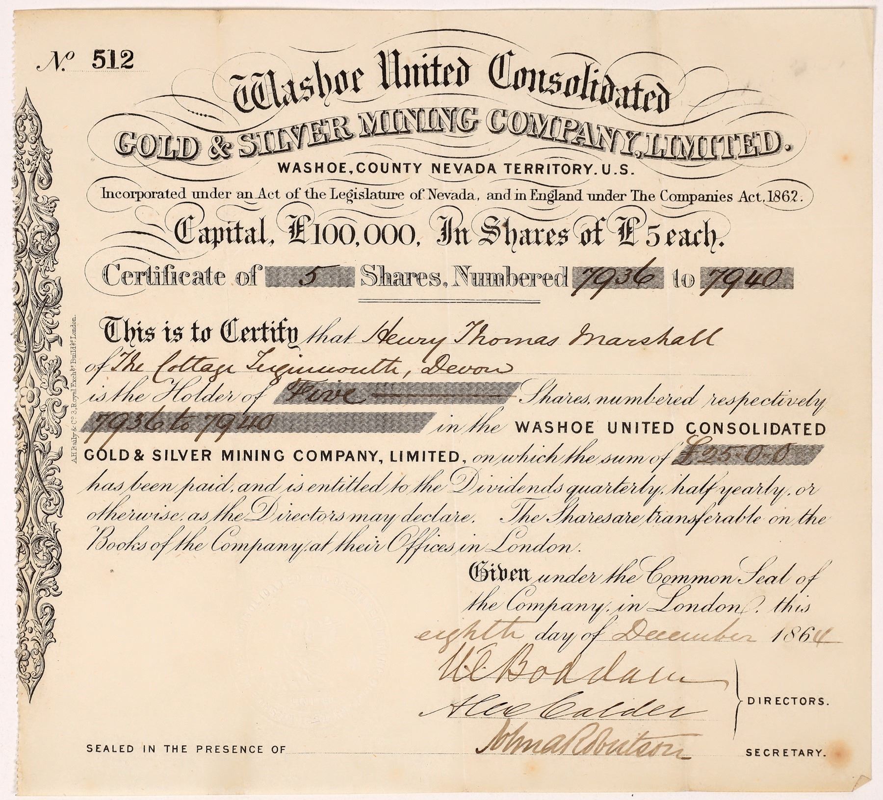 Washoe United Consolidated Gold & Silver Mining Company Stock - Washoe, County, N.T. Incorporated in Nevada and England in 1862 and capitalized at 100,000 English pounds. One pound was worth $5.56 at that time. Cert. #512, issued to Henry Thomas Marshall in 1864 for 5 shares Datelined London December 8th, 1864 (Nevada became a state on Oct. 31, 1864). Signed by the British Directors and Secretary of the company. Embossed with company stamp. Plain white paper with embossed seal, black print and no vignette other than a decorative panel at the left side. Uncancelled. Printer not noted. 8 x 8.5."Datelined London. Promoted in England as a 'fail-safe" investment, the company's over-confident development included building 7.5 miles of canal and a 20-stamp mill in the first three years. However, it had returned no dividends and was by then on the verge of collapse. Other British undertakings in Nevada convinced investors to pay up based on the glowing reports of the success of the Washoe United venture and the richness of the Comstock, even though the properties being touted were far removed from both of those locations. The owners trusted in the geographical ignorance of their audience. [Ref: British Investments and the American Mining Frontier, 1860-1901, by Clark C. Spence, from The Evolution of International Business, 1880-1845, Vol. ll, Routledge, Taylor & Francis Group, London, 1958, 1993, pg. 62].