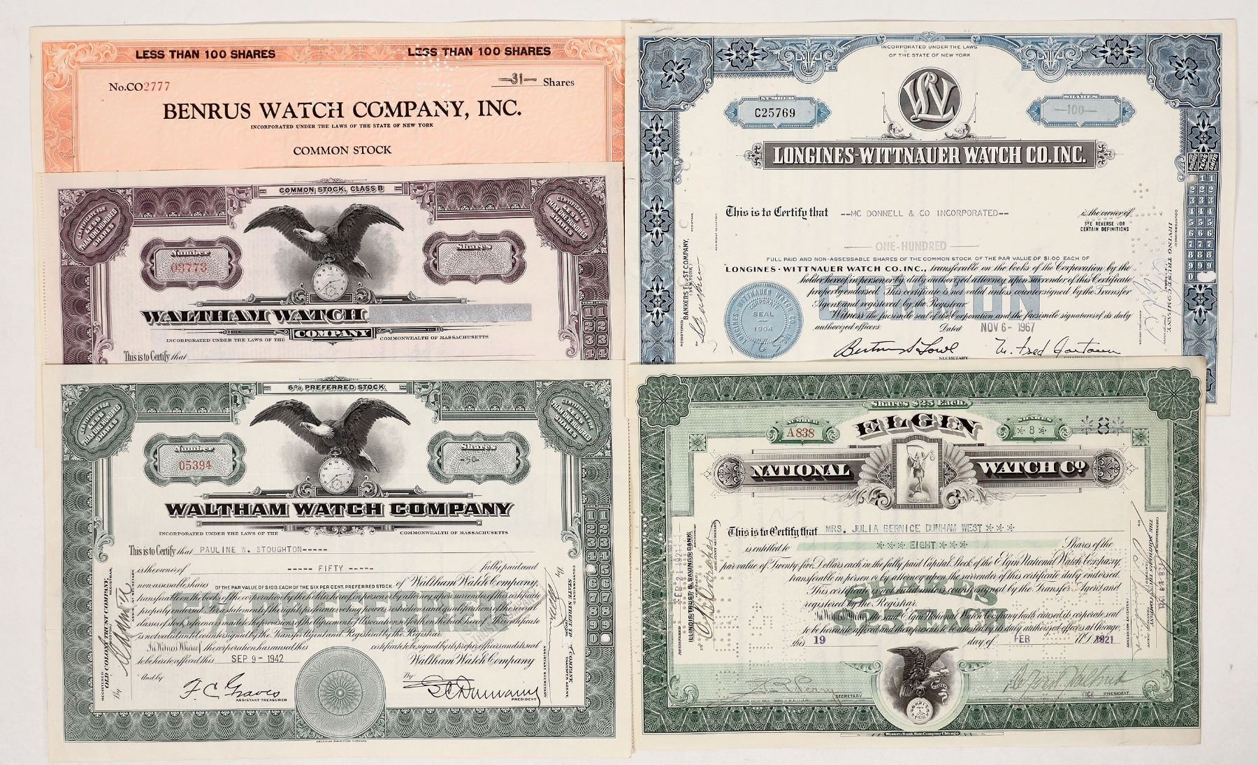 Group of 5 stock certificates, dated 1921-1967, from four watch companies: Elgin National Watch Co. (1), Longines-Wittnauer Watch Co. Inc. (1), Waltham Watch Co. (2), and Benrus Watch Company Inc. (1). All certificates are both issued and cancelled with stamped or hole-punched cancellations. All in good condition.