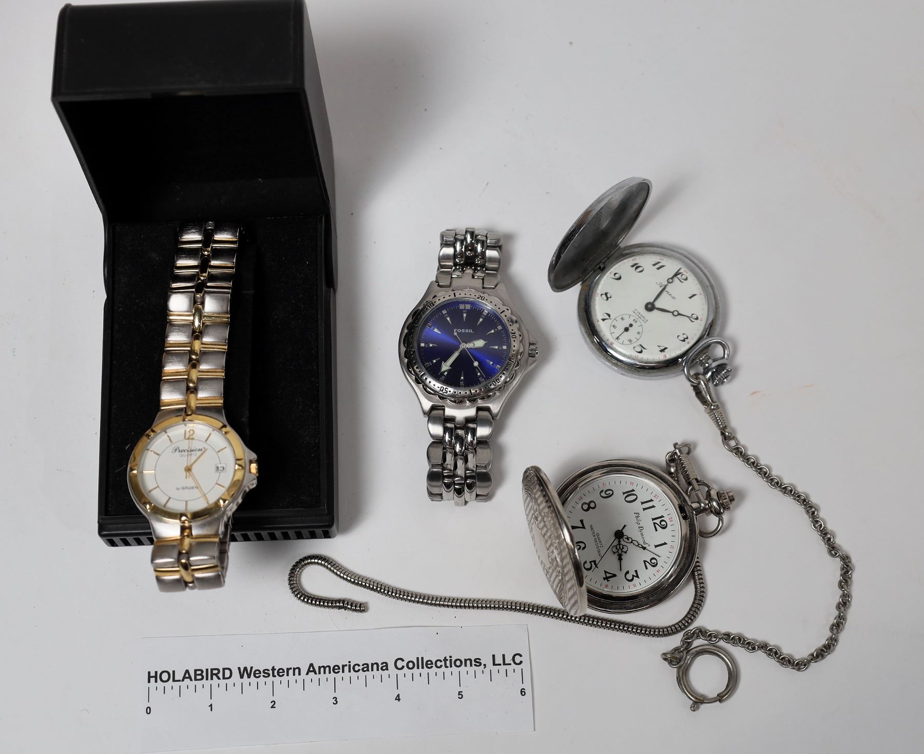 White metal Arnes pocket watch, Swiss, with I Love You etched inside cover. Philip Dymond pocket watch, Japan. Fossil wrist watch with blue face. Precision by Gruen wristwatch in case, gold accents