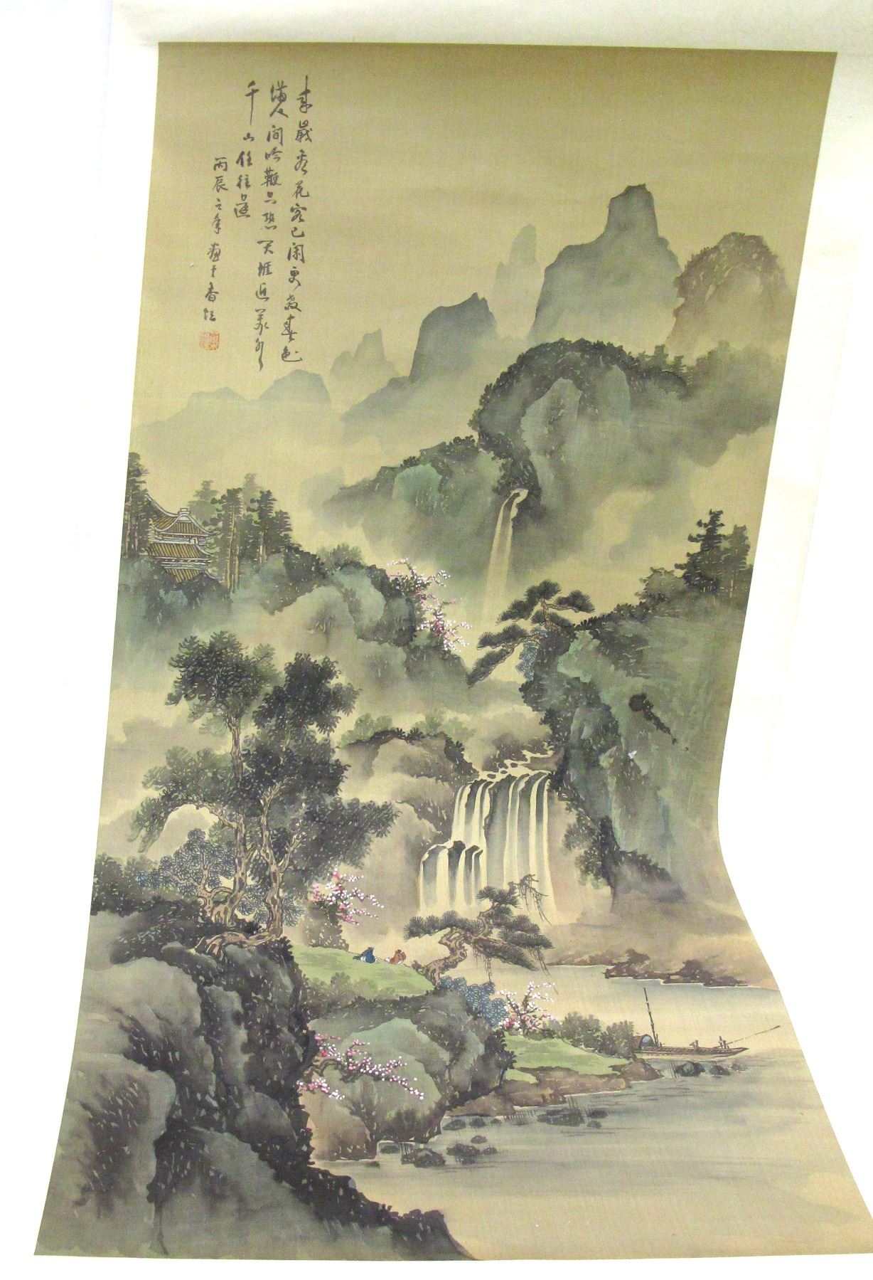 Water Color attached to linen. This is an original water color, artist unknown. Beautiful Japanese landscape with water falls, cherry blossoms & people. This is ready to hang on wall. The water color is 23" x 46" & with Linen backing is 27" x 71".