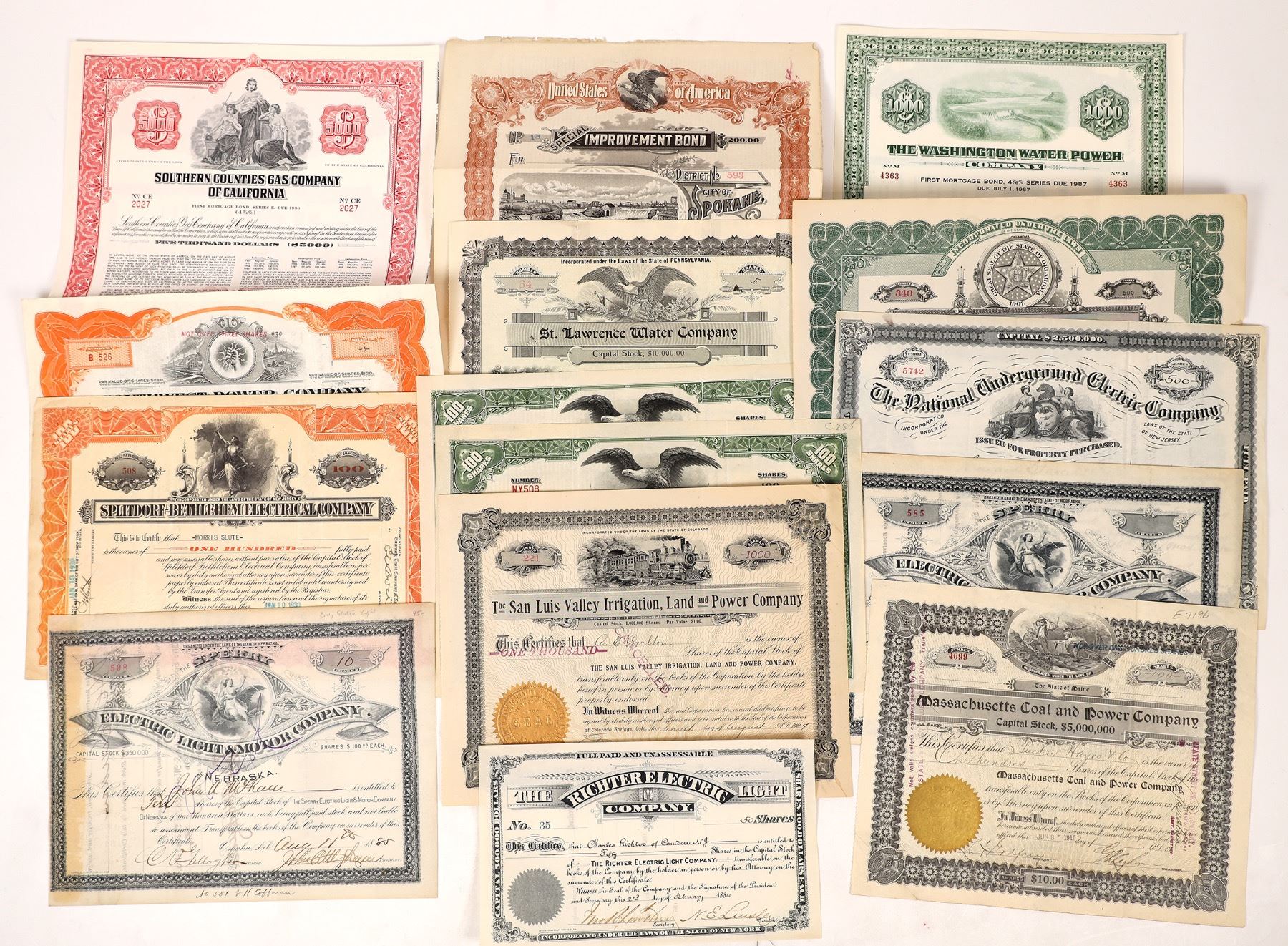A collection of 15, includes three bonds and 12 stock certificates related to water, power and electric companies, c1882-1965. See photo(s) for more details. Ken Prag Collection