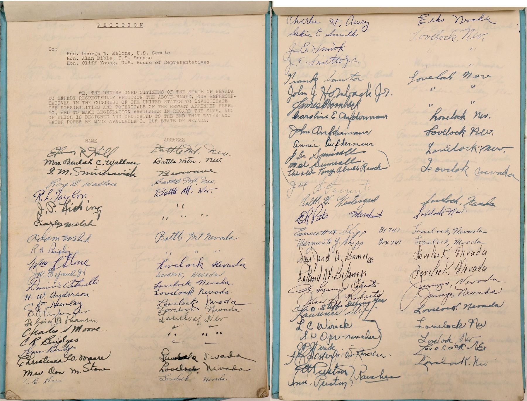 1950's original petition signed by about 200 Nevadans requesting legislation that water be made available to the State of Nevada. At the time, there was a power grab by the Fed to acquire/take all water rights on Federal Land. It met with stiff opposition, and this petition is one part of the result. The signers are out of the Lovelock-Winnemucca area. From the Nevada Mining archive of John Heizer.