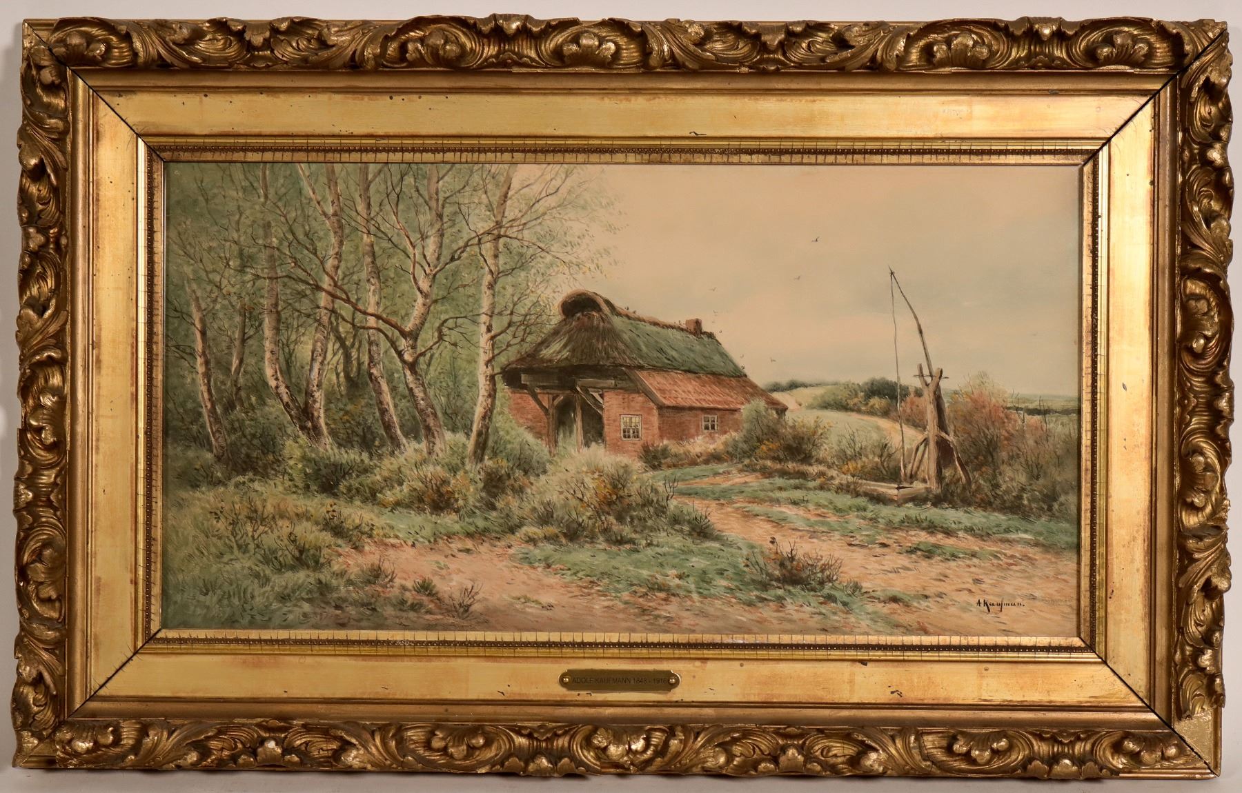 Beautiful watercolor of a barn with a partially thatched roof. Signed A. Kaufman (painting mis-identified as being painted by Adolph Kaufamm). We are unable to identify the actual artist. Artwork: 14" x 26.5. Ornate frame: 21.25" x 41.25".