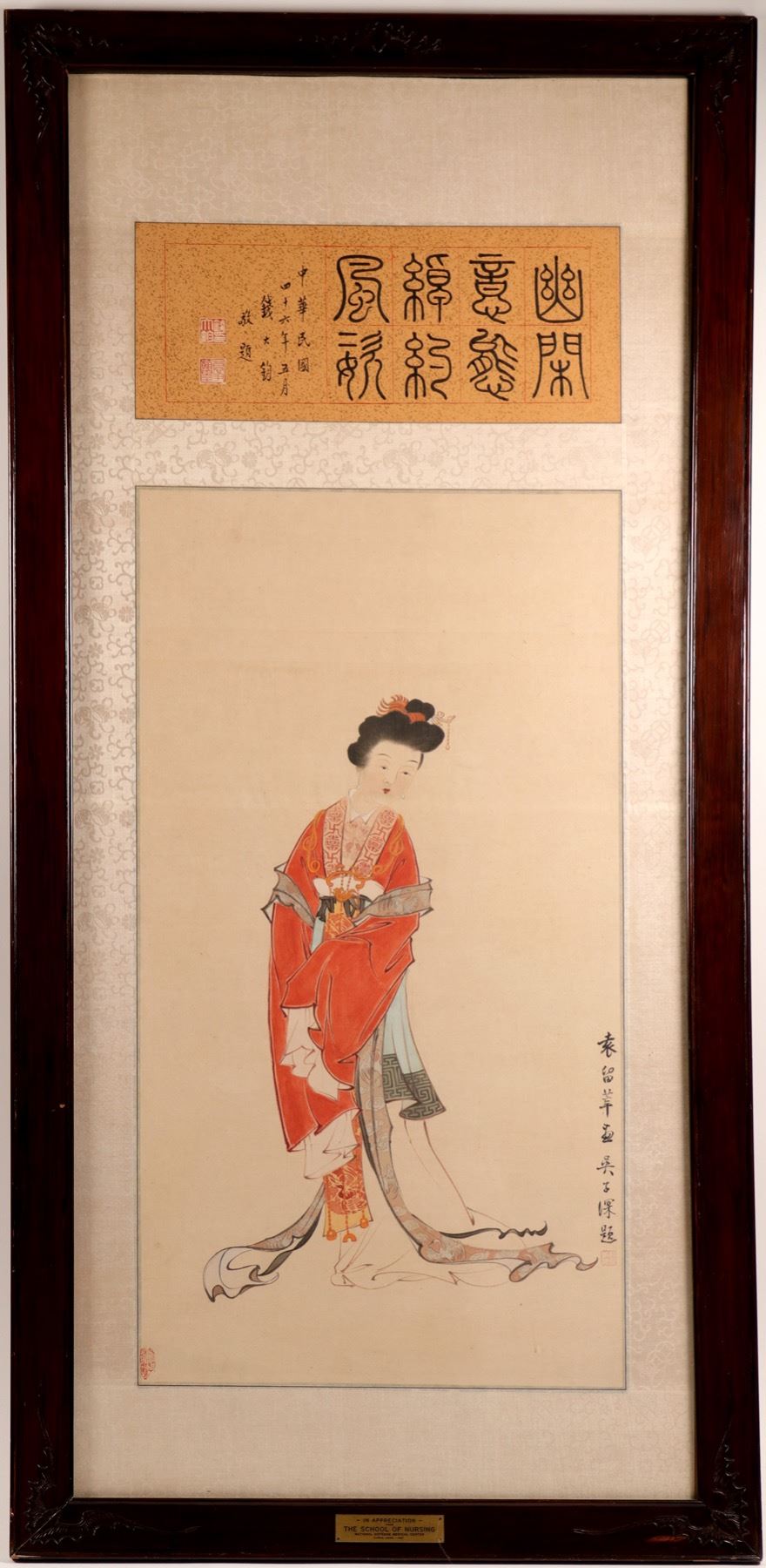 Here is a very beautiful, and unusual Item. It is a very early combination of , watercolor, pen and ink picture inset with silk border. I call her "The Gracious Lady " ( I made that name up !). It depicts a very nice Chinese lady who walks graciously. It is 55" high x 26" wide, with a dark frame. Carved on the frame, at the top are 3 flying bats and two bats at the bottom !! These bats represent : " Wu Fu", which symbolizes long life, wealth, health, love of virtue, and a peaceful death. At the base is a brass plaque that reads: In Appreciation/ " The School Of Nursing" / National Defense Medical Center/ Taiwan, China...1937. Perfect condition. If you get this item, you may also have the 5 blessings of " WUFU". ( RH).