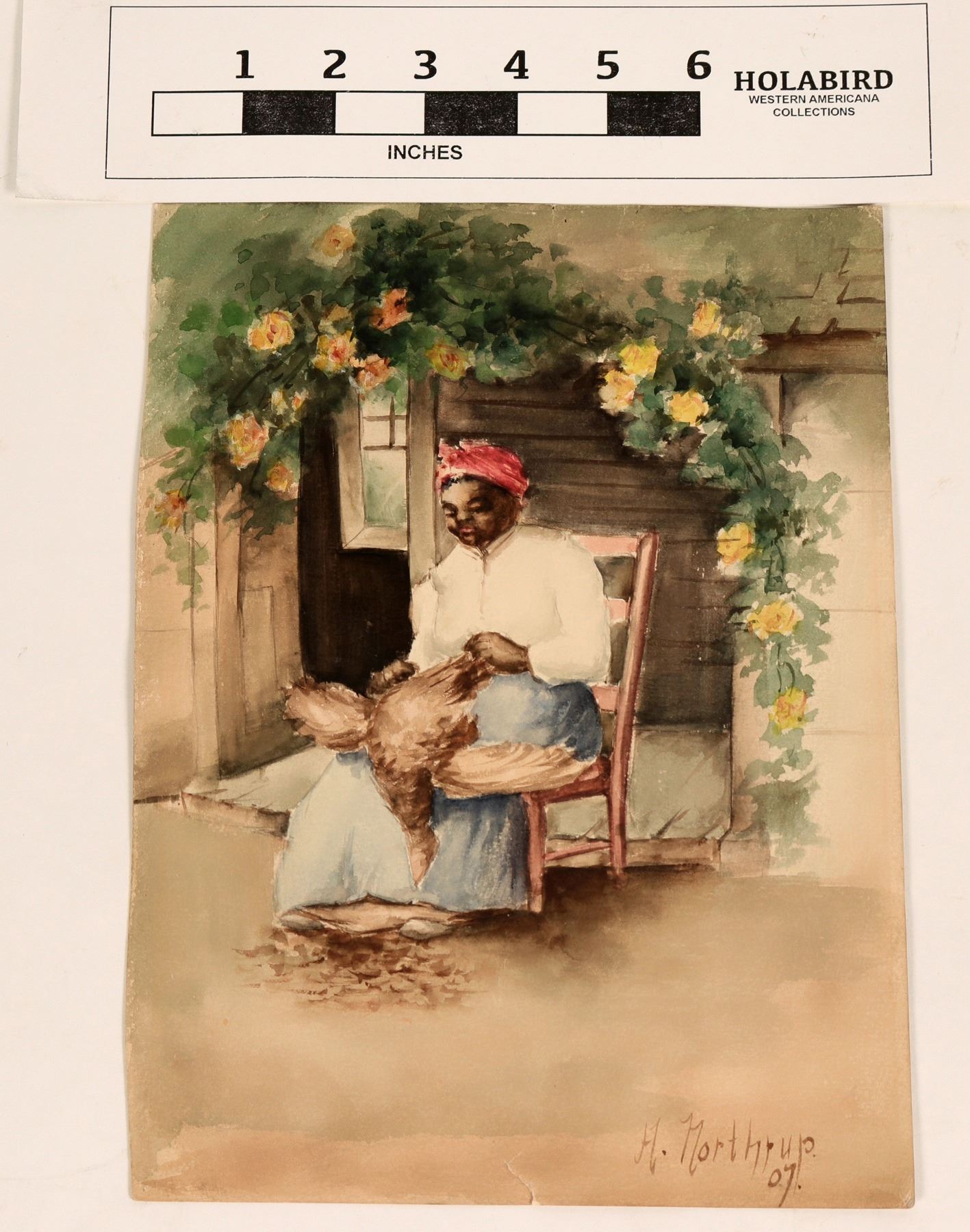 Watercolor painting of an African-American woman plucking a chicken in front of a farmhouse entrance with climbing yellow flowers. Signature is A. Northrup '07. Anne Northrup is a grandmother of Fred Northrup Holabird, and the piece is thought to have been painted in Missouri before that generation moved west to California. There is a half-inch tear in the middle of the bottom edge, and tape marks on the back suggest it had been mounted in a frame at some time. Dimensions are 8 x 10-3/4 inches.