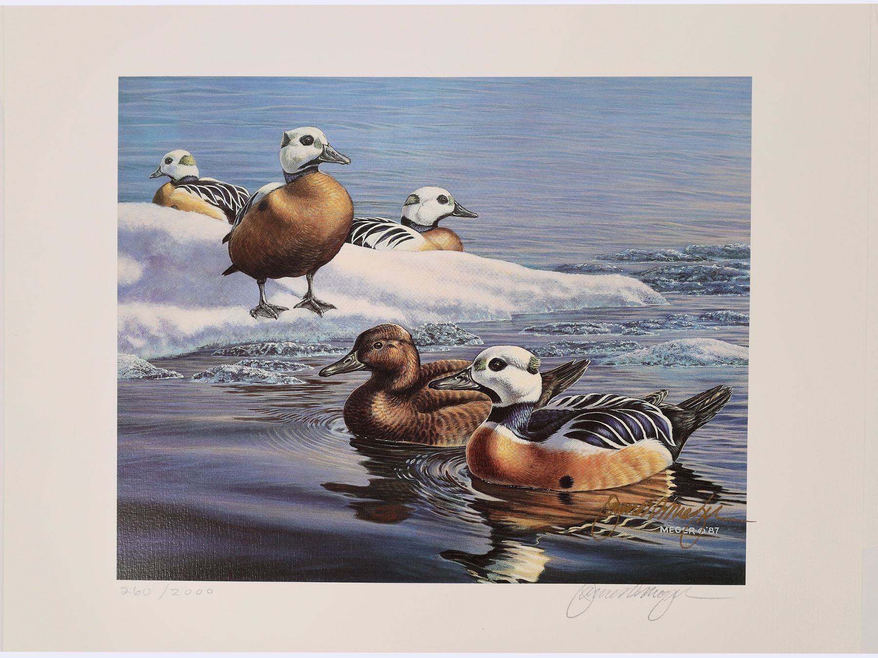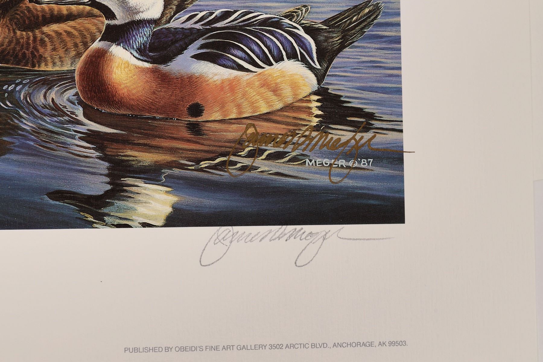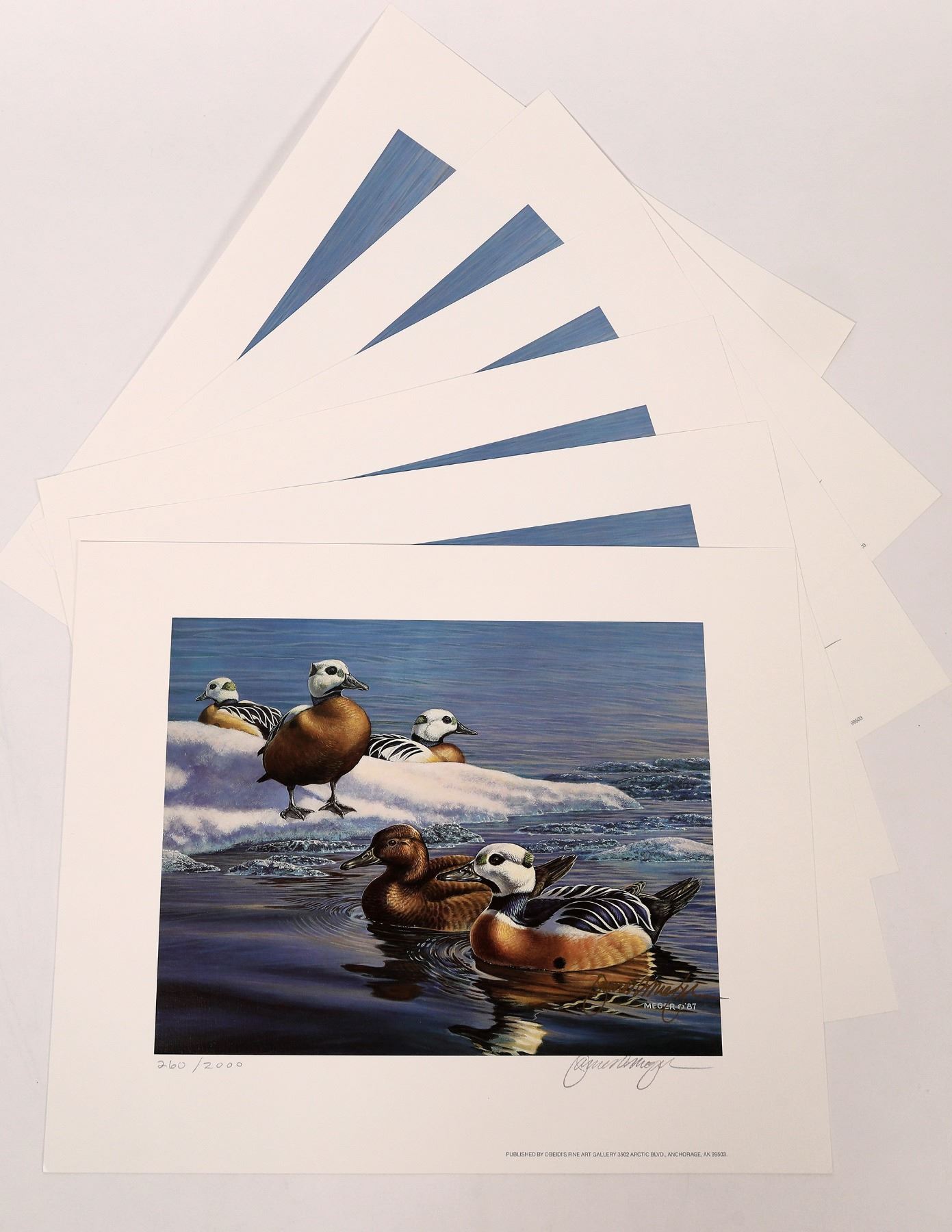 7 waterfowl prints by James Meger featuring 5 birds. Numbered and signed by James Meger, #254-260/2000. 11.5x14".