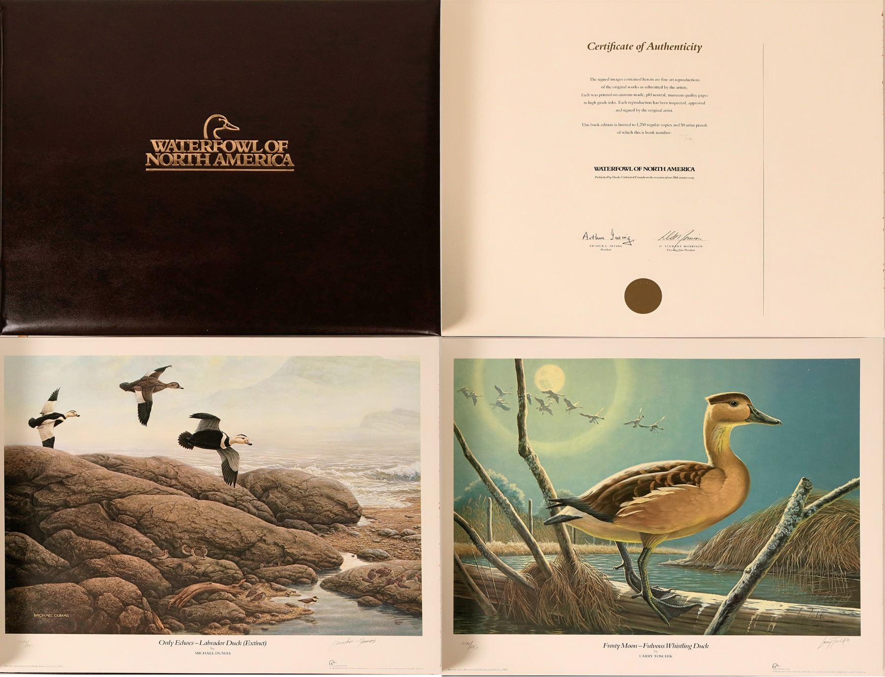 This is a numbered album with 44 color plates of ducks of North America; # 1090 of 1200 by Irving for Ducks Unlimited. This leather bound book is complete with original mailer box. Like new condition. c.1985.