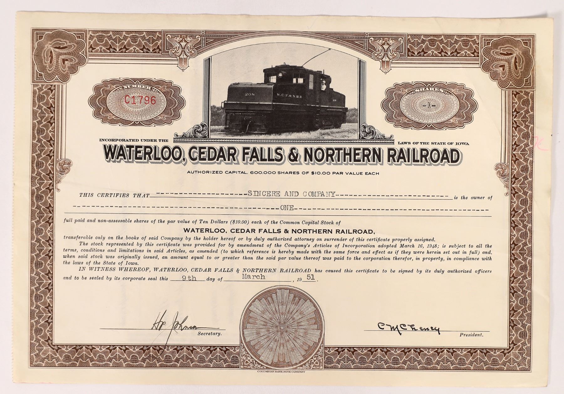 I/U 1951 Waterloo, Cedar Falls & Northern Railroad stock. Ken Prag Collection
