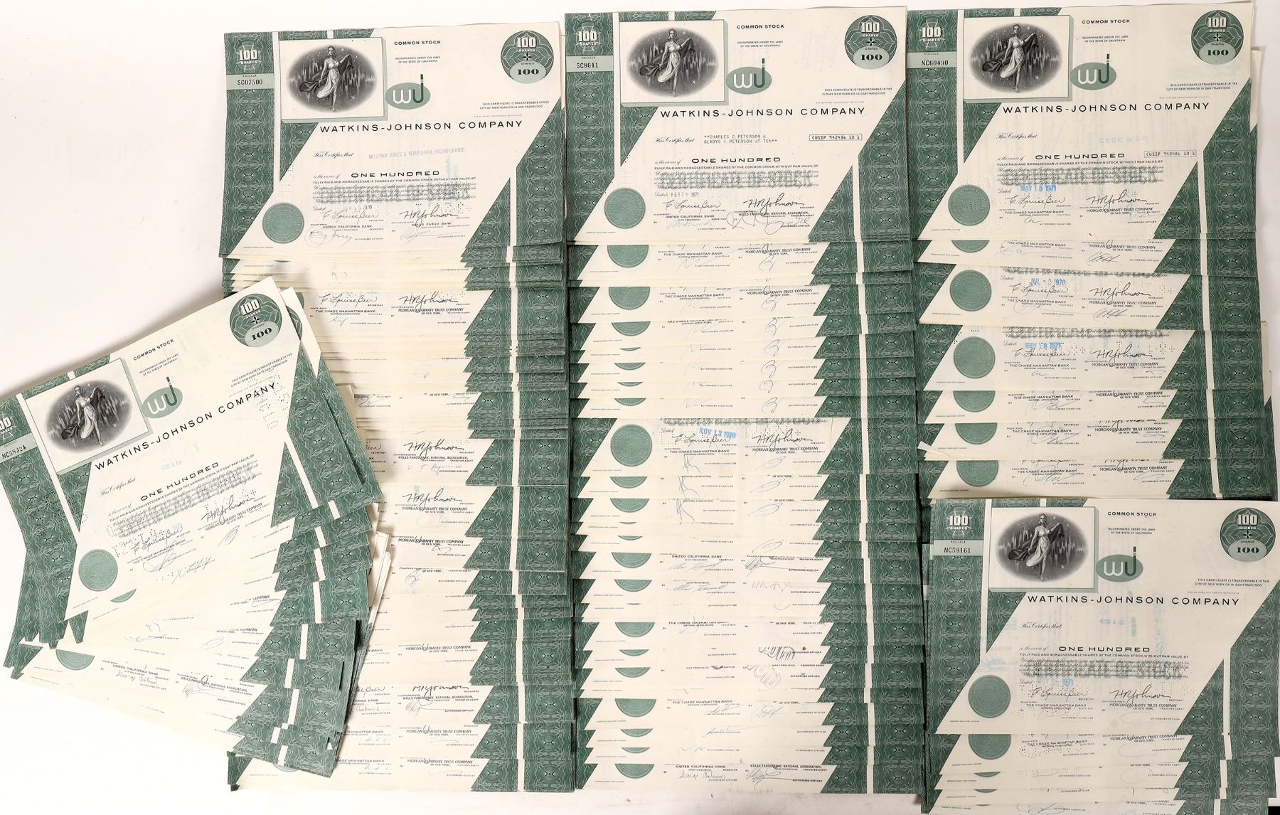 Three inch pile of about 300 stock certificates from the Watkins-Johnson Company. Green ink with vignette of a lady dancing in the stars. 8 x 12 inches, all issued. Watkins-Johnson Company was a designer and manufacturer of electronic devices, systems, and equipment. The company was formed in 1957 by Dean A. Watkins and H. Richard Johnson, and was headquartered in Palo Alto, California. Its products included microwave tubes, solid-state microwave devices, electronic warfare subsystems and systems, receiving equipment, antennas, furnaces and semiconductor manufacturing equipment, and automated test equipment.