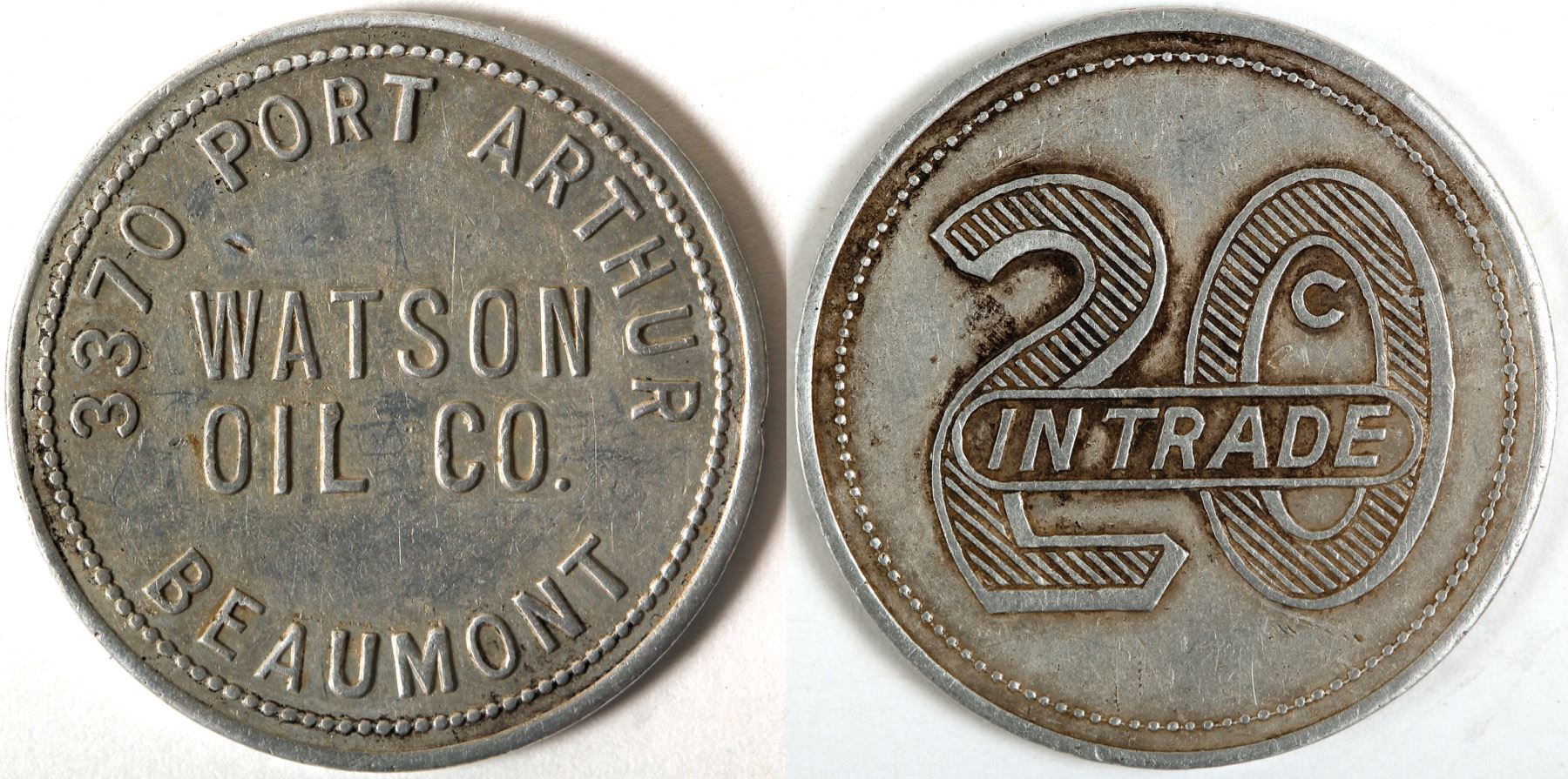 Round aluminum 32mm 3370 PORT ARTHUR / WATSON OIL CO. / BEAUMONT / 20C IT. Early oil token. Not in Adams. State: Texas City: Beaumont Date: HWAC# 62334