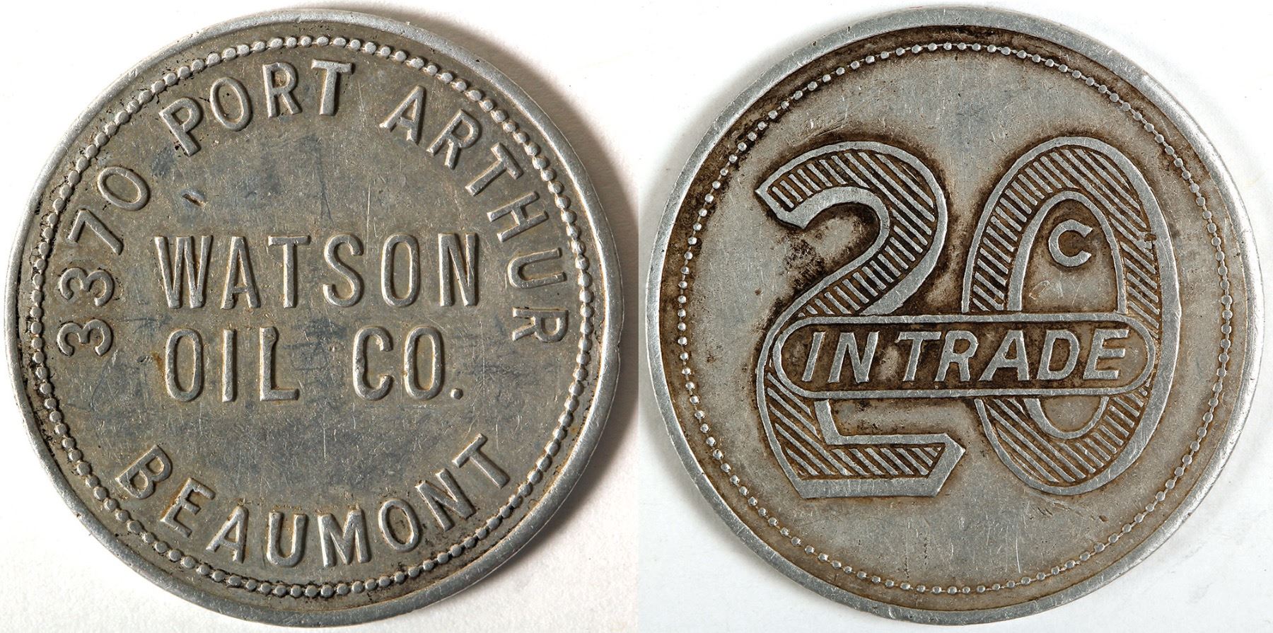 Round aluminum 32mm 3370 PORT ARTHUR / WATSON OIL CO. / BEAUMONT / 20C IT. Early oil token. Not in Adams. HWAC# 62334 Date: Location: Beaumont, Texas