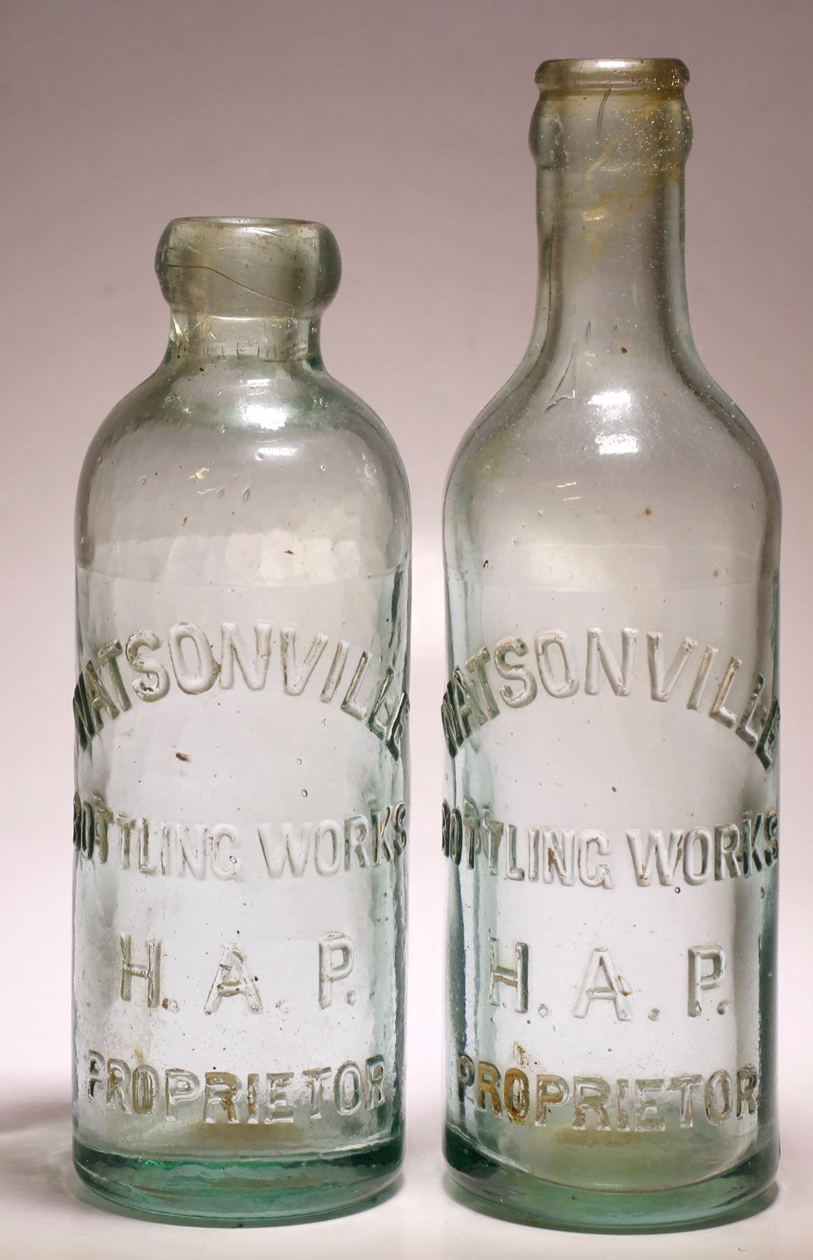 Watsonville ( au ) / Bottleing Works / H. A . P. / Proprietor // Aqua , hutchinson style soda. 6 5/8" tall,tooled top, four piece mold. Clean and shiny, with great texture and whittle marks. But, there is a 3/8" bruise in the top of the bottle, very hard to see. No other problems . Item #2 of 2: Watsonville ( cu) / Bottleing Works / H. A. P. / Proprietor // Aqua , crown top soda, tooled top, 4 piece mold . 7 7/8" tall, clean and shiny , like a brand new bottle. Nice pair of bottles, in different styles of lip applications !! ( RH ). State: California City: Watsonville Date: 1890's 1900. / 1900-1910 HWAC# 77419