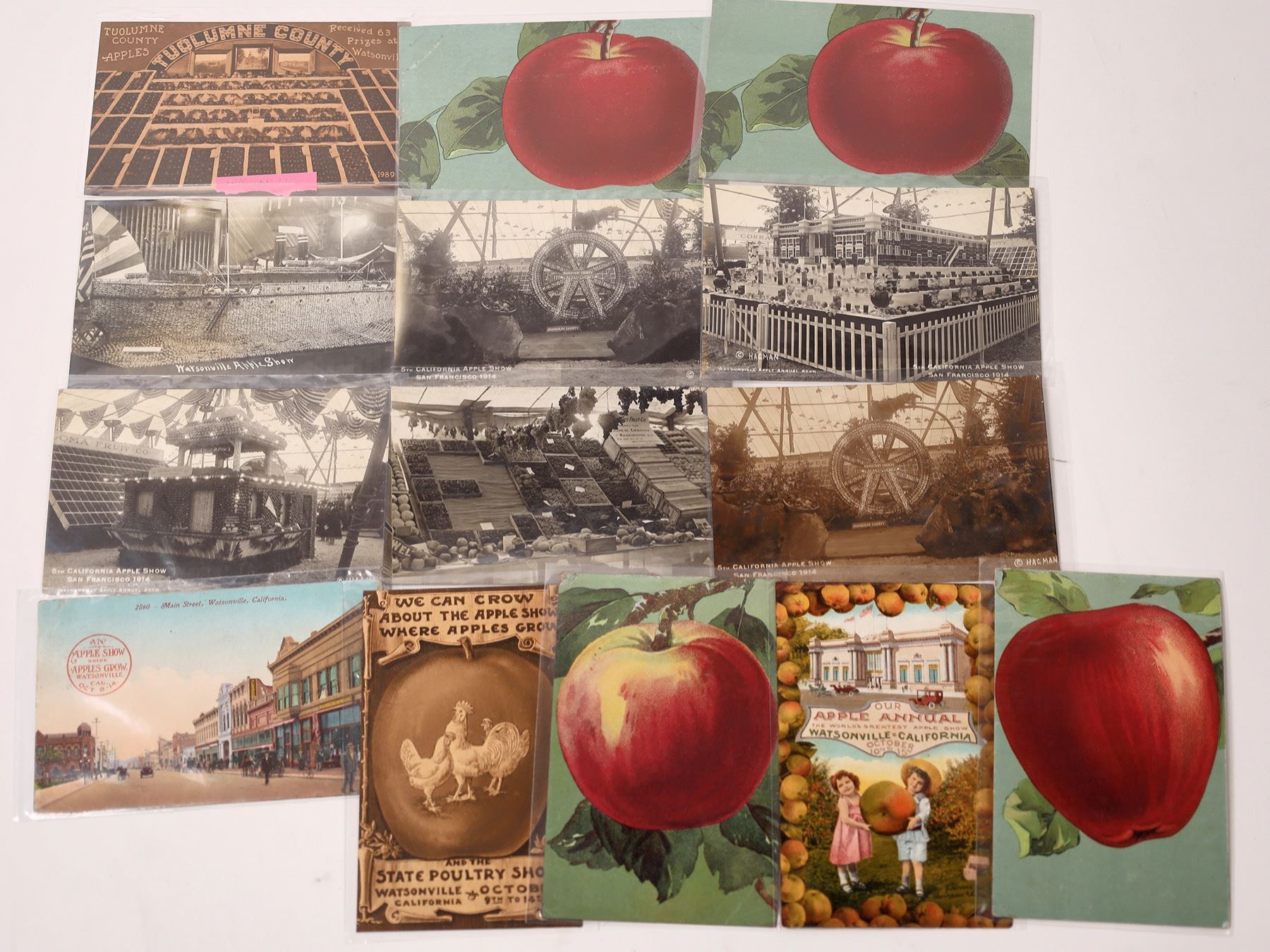 Lot of 14. Borderless, some amber cards. Four postmarked 1910 : Watsonville Corona . Six street level RPC's of entries of different dispalys one looks like a ship made from apple slices. Street scene Main St. c1915 ad for Apple Show. Five ad cards. Two amber cards: Tuolumne County Apple Display and one ad for combined Apple and Poultry Show