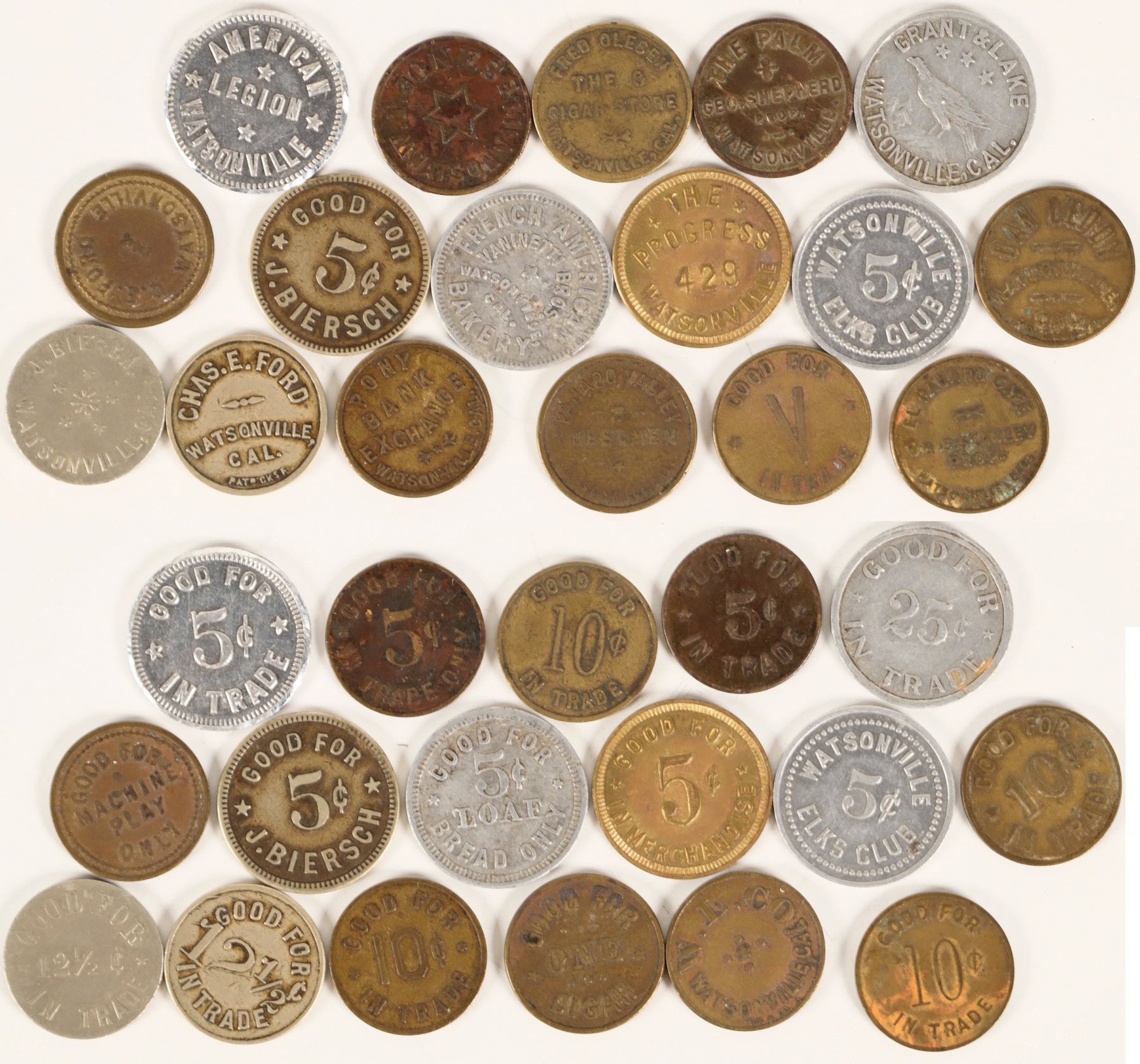 Includes: Fred Olesen, the O Cigar Store, J. Bierch (2), Grant & Lake, Am. Legion, Pony Bank Exchange, Watsonville Elks Club, Pajaro Valley Wheelmen, The Palm, Geo. Shephard, Prop., The Progress, El Pajaro Cafe, French American Bakery-Vaninetti Bros.,W.L. Co., Dan Leddy, Chas. E. Ford, C.E. Ford, and W.P. Jones.