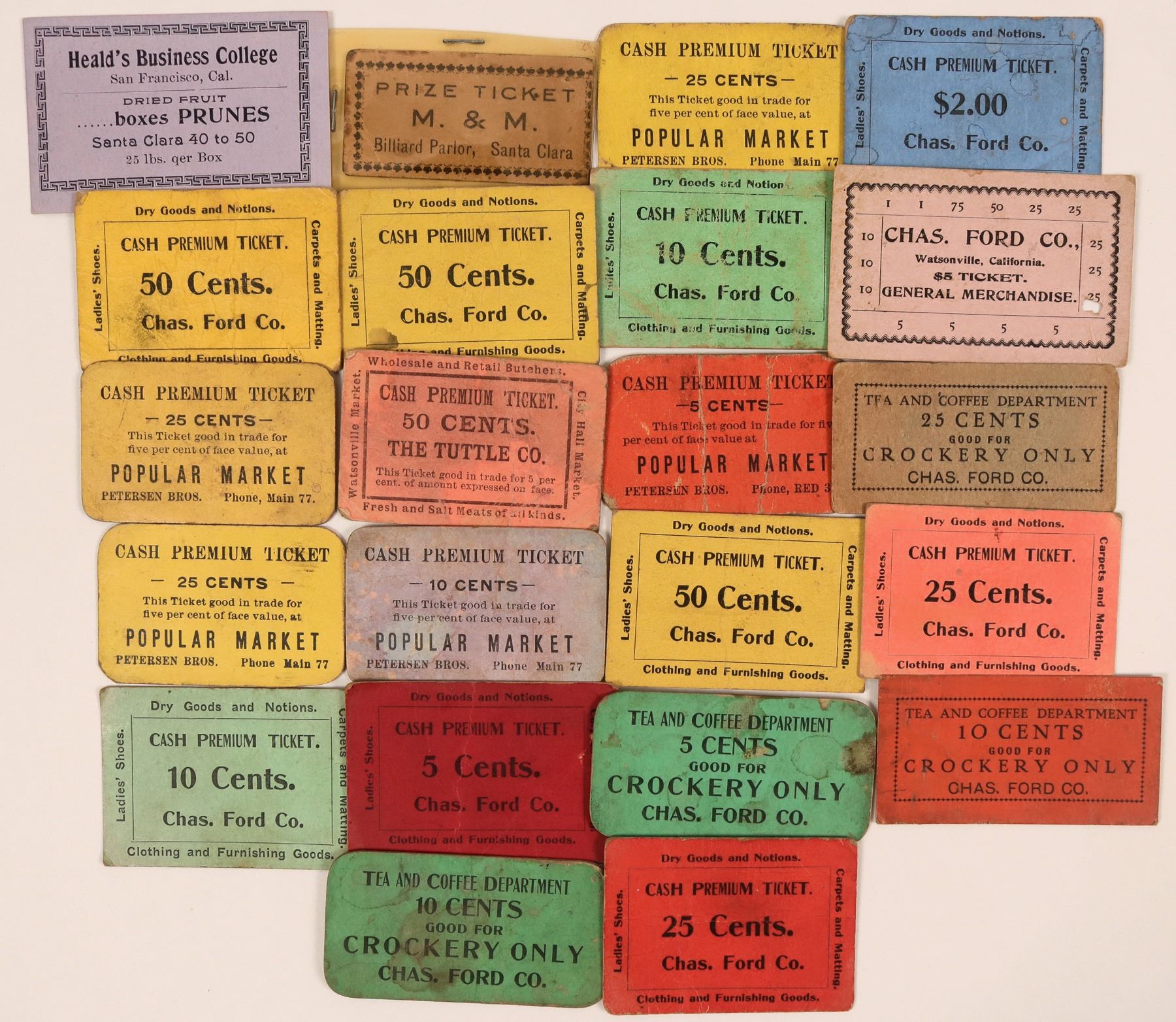 Lot of 19 cardboard tokens from Watsonville, one from Santa Clara, one from San Francisco.