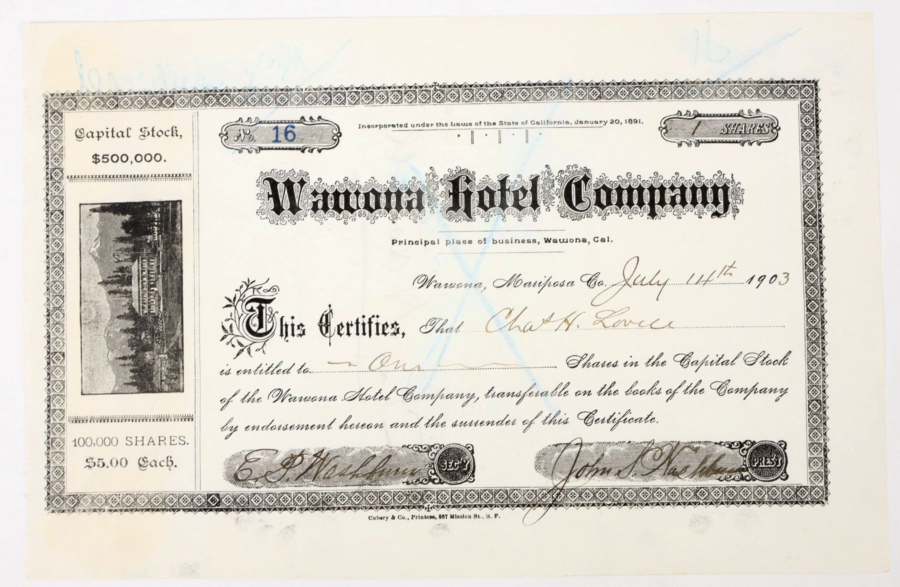 Wawona Hotel Company Stock Certificate, Yosemite, 1903 [197994]