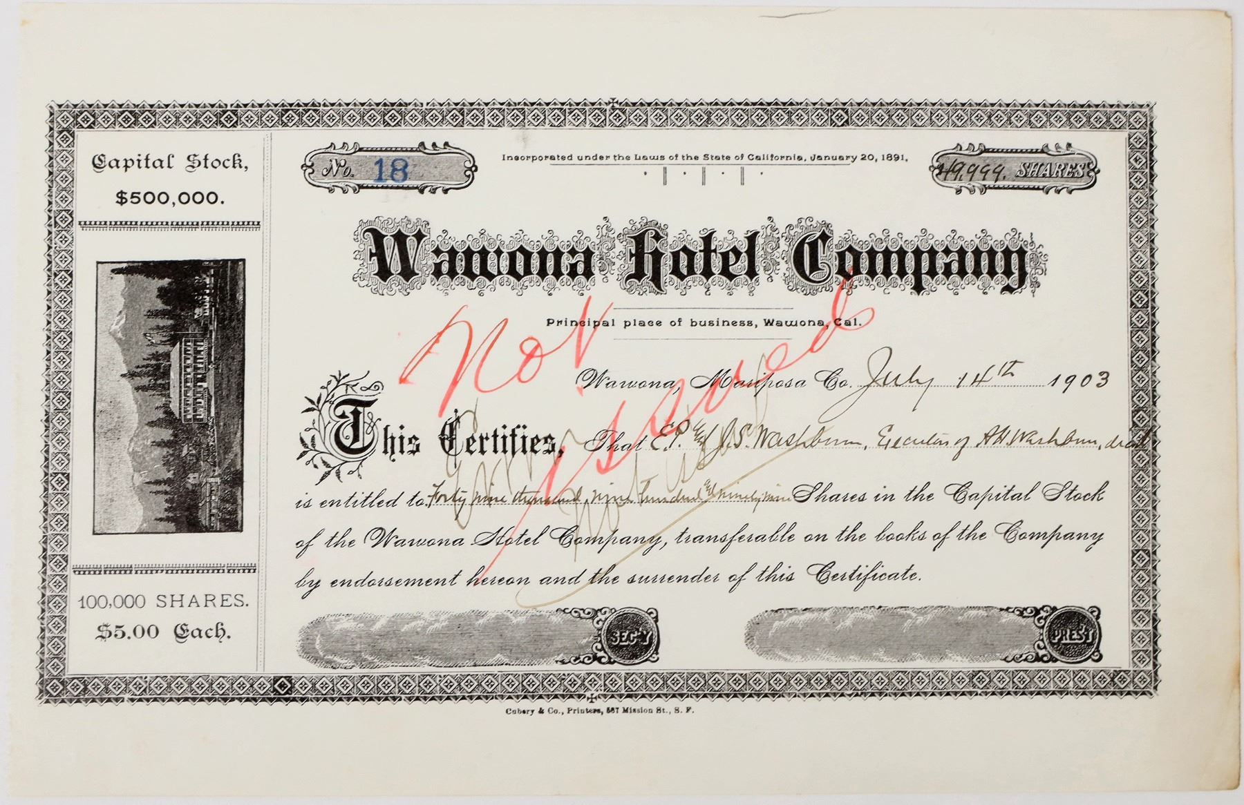 Wawona Hotel Company Stock Certificate, Yosemite, 1903, for 49,999 shares [197995]