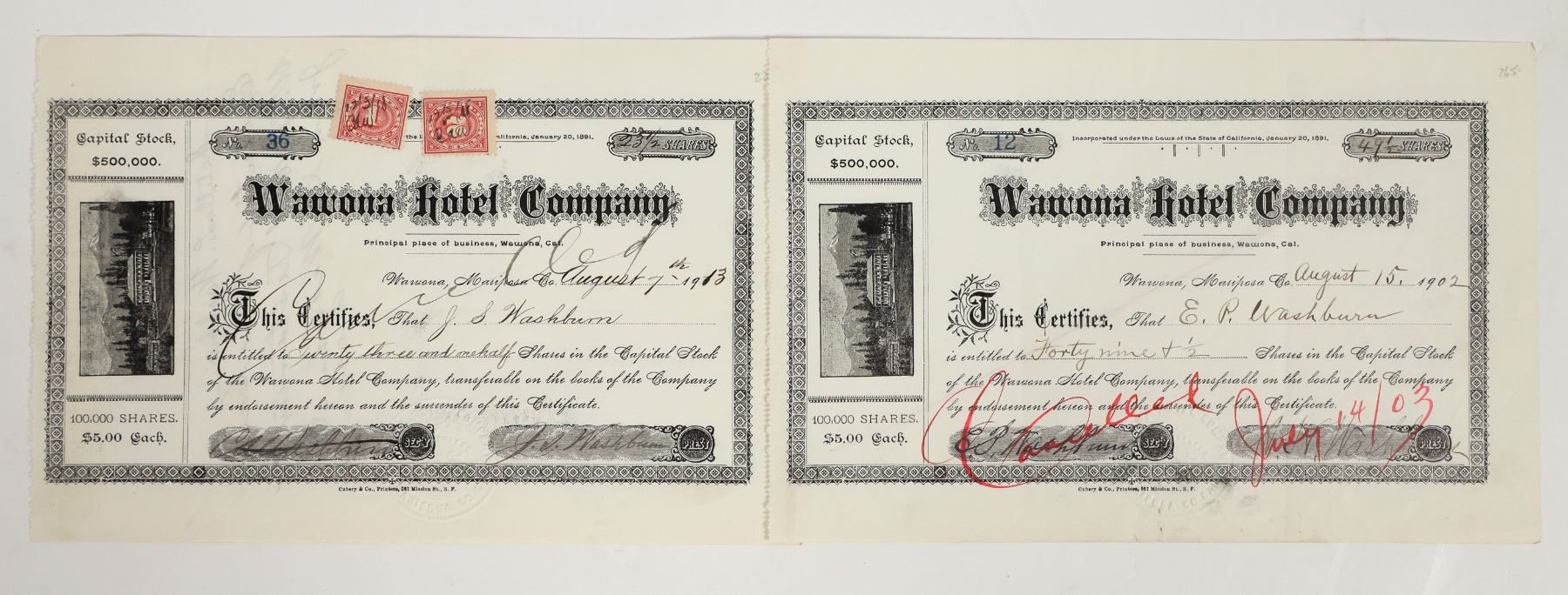 Lot of 2. 1) Low number 12, issued to secretary EP Washburn in 1902 for 49.5 shares. Signed by him and president AH Washburn. Pen cancelled. 2) No. 36 issued to president JS Washburn in 1913 for 23.5 shares. Also signed by secretary CA Washburn. Pen cancelled. Both have the same design. Black border and print, vignette of the hotel. Dateline Wawona, Mariposa Co. Three Washburn brothers from Vermont went to California to seek their fortunes and found modest ones in a mine and general store at Mormon Bar, two miles from Mariposa. Their mine and store weren't challenging enough so they improved the Chowchilla Mountain Road from Mariposa to Wawona and, on December 26,1874, purchased the stopping place then known as Clark and Moore's. (Later to be called Wawona - Big Trees.) The Washburns bought the lodging house itself, the open bridge, irrigation ditch, sawmill, barn and 160 forested acres. The original hotel burned to the ground in 1878, but, undaunted, the brothers proceeded to erect in 1879 a new 140 by 32 foot hotel building, called the Long White. By the time U.S. Grant visited later that year, cedar trees had been planted and a large fountain installed. Today it is a National Historic Landmark and very popular Yosemite building. [Wawona's Yesterday by Sargent]