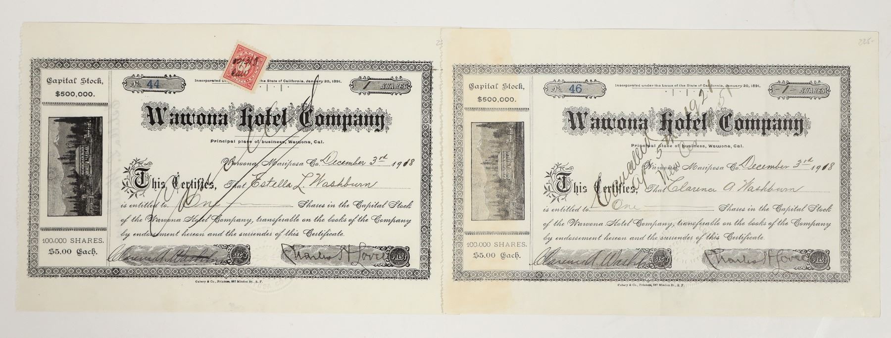 Lot of 2. 1) No. 44, issued to secretary Estella L. Washburn in 1918. Signed by president Charles Lovell and secretary Clarence A. Washburn. Pen cancelled. 2) No. 46, issued to secretary Clarence A. Washburn in 1918. Also signed by president Charles Lovell. Pen cancelled. Both have the same design. Black border and print, vignette of the hotel. Dateline Wawona, Mariposa Co. Three Washburn brothers from Vermont went to California to seek their fortunes and found modest ones in a mine and general store at Mormon Bar, two miles from Mariposa. Their mine and store weren't challenging enough so they improved the Chowchilla Mountain Road from Mariposa to Wawona and, on December 26,1874, purchased the stopping place then known as Clark and Moore's. (Later to be called Wawona - Big Trees.) The Washburns bought the lodging house itself, the open bridge, irrigation ditch, sawmill, barn and 160 forested acres. The original hotel burned to the ground in 1878, but, undaunted, the brothers proceeded to erect in 1879 a new 140 by 32 foot hotel building, called the Long White. By the time U.S. Grant visited later that year, cedar trees had been planted and a large fountain installed. Today it is a National Historic Landmark and very popular Yosemite building. [Wawona's Yesterday by Sargent]