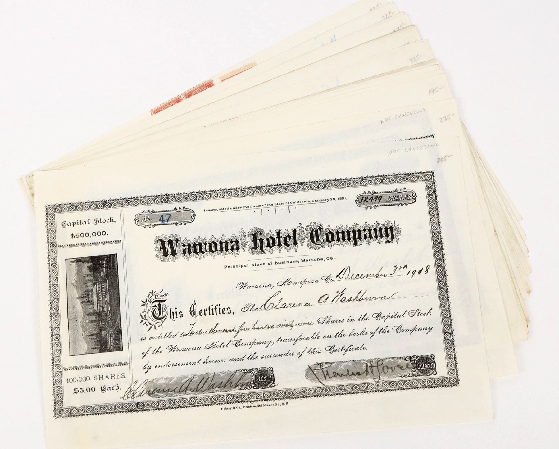 Lot of 17. I/U, I/C. Issued 1905-23. EF cond. Wawona Hotel Company. Inc. Printed by Cubery & Co., Printers, S.F.