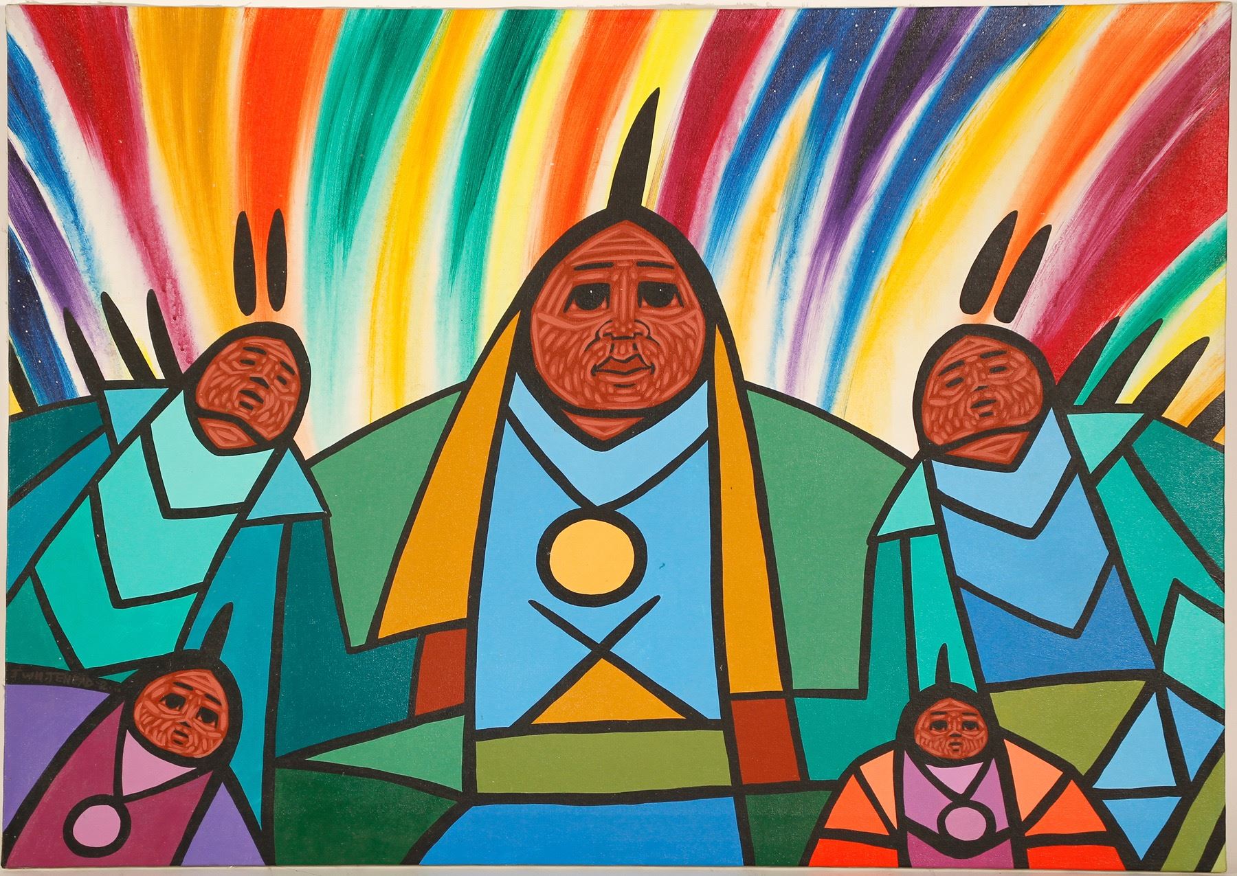 Vivid original acrylic painting by Jerry Whitehead. "Over the years, Jerry Whitehead's artwork has gone through a number of stages. The one thing that has remained constant throughout this progression is his focus on powwows and powwow dancers.'Powwow dancers have been an ongoing theme in my work since I began painting. Seeing the dancers as a child had a lasting impression. The subject matter has been ideal for expressing a part of my culture as well as accommodating changes in my work,' says the artist from the Peter Chapman First Nation. As a child in Saskatchewan, Whitehead says he was interested in art like any of his friends. He says, 'I used to draw as a kid. I used to draw all the time.' Unlike the average kid, he used almost any source he could find for his drawings including the ashes that remained from fires and the lead in the bullets his father used as a hunter. In his early teen years, Whitehead moved on from drawings done with pencils and lead to paintings. He believes that his interest in art comes from his family. Whitehead remembers his grandmother working with hides and says that his mother did beadwork and braided rugs. His family supported his talents and allowed him to develop them. "I was lucky to be encouraged along the way," he says. In addition to familial encouragement and an abundance of natural talent, Whitehead has sought out technical training. He obtained a Bachelor of Arts in Indian Art from the Saskatchewan Indian Federated College and a Bachelor of Fine Arts from the Nova Scotia College of Art and Design in Halifax. Upon completing his formal training, Whitehead began showing his work in exhibitions across the country. In the eleven years since, he has had numerous shows in Saskatchewan, Ontario, Nova Scotia and British Columbia. His work has been commissioned by University Hospital in Saskatoon and the Summer Pops Symphony at Cable Wharf in Halifax to name but two. Whitehead says that his style has changed over the years. "I went through a lot of different stages," he says. In the beginning, Whitehead did beadwork and attached the work to his paintings. He also says that, for awhile, he used to wrinkle his canvas to give his paintings a dimensional appearance. But, as in his current work, powwow dancers and powwows remained an integral theme. He currently produces abstract paintings that demonstrate his fondness of vivid colours. This, he believes, was learned from his mother and her brightly coloured, braided rugs. He says that this current style 'just developed' over time. 'My work is a little tamer now,' he says. 'It's more refined.' He attributes part of this change to development over time saying he took more risks when he first graduated from school. The other part of the change can be attributed to the fact that he is now a family man. As such, Whitehead says that he is incorporating family themes into his work on a more frequent basis." Adapted from jerrywhitehead.com. Unframed 27x38". Includes a photo of the artist with the