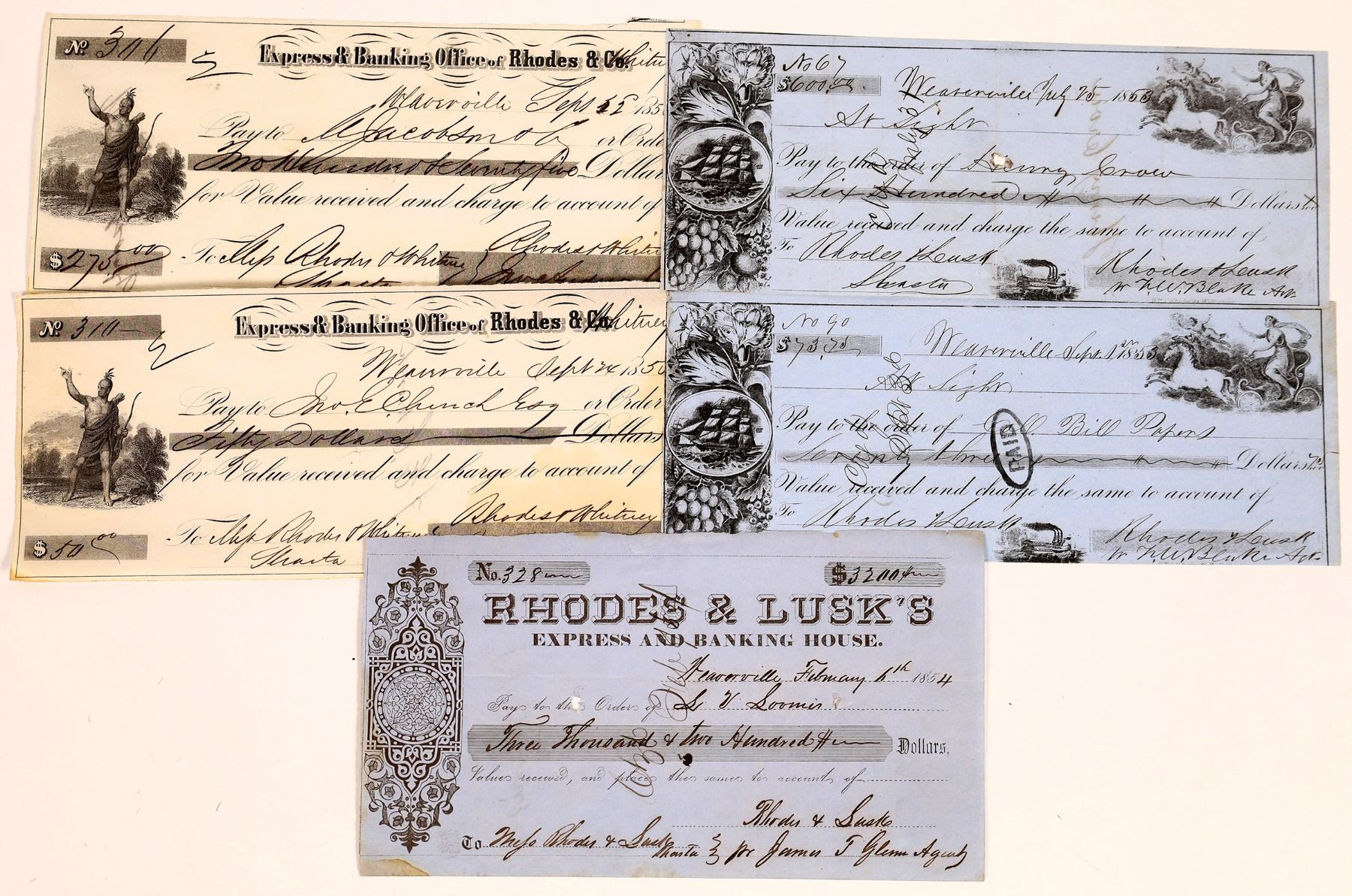 1-2) Handwritten (early) Rhodes & Lusk, 1853, Three vignettes: chariot, clipper and steamship vignettes. Both to Rhodes & Lusk at Shasta. Number 67 and 90. 3) Printed Rhodes & Lusk. 1854. To Rhodes & Lusk in Shasta. For $3,200. 4-5) Express & Banking Office of Rhodes & Co. printed. 'Co.' is overwritten with 'Whitney.' To Rhodes & Whitney at Shasta. Native American vignette. For $225 and $50. Weaverville was founded in 1850, Weaverville is a historic California Gold Rush town today. Located at the foot of the current Trinity Alps Wilderness Area, Weaverville was once home to approximately 2,000 Chinese gold miners, and had its own Chinatown. Its Chinese Joss House is considered today to be the finest example of an early Chinese place of prayer. "Weaverville was one of three major gold rush towns that formed in Northern California during the early 1850s in what was a vast and isolated wilderness. Gold discoveries were made in the Trinity River region all the way back to the early 1840s. No attempts were made to stay and mine the gold however as this area was so rugged and remote that long-term survival was nearly impossible for individual prospectors or small groups of miners. The huge influx of miners into California resulted in the first attempts at settling and mining the Trinity region." [westernmininghistory.com]