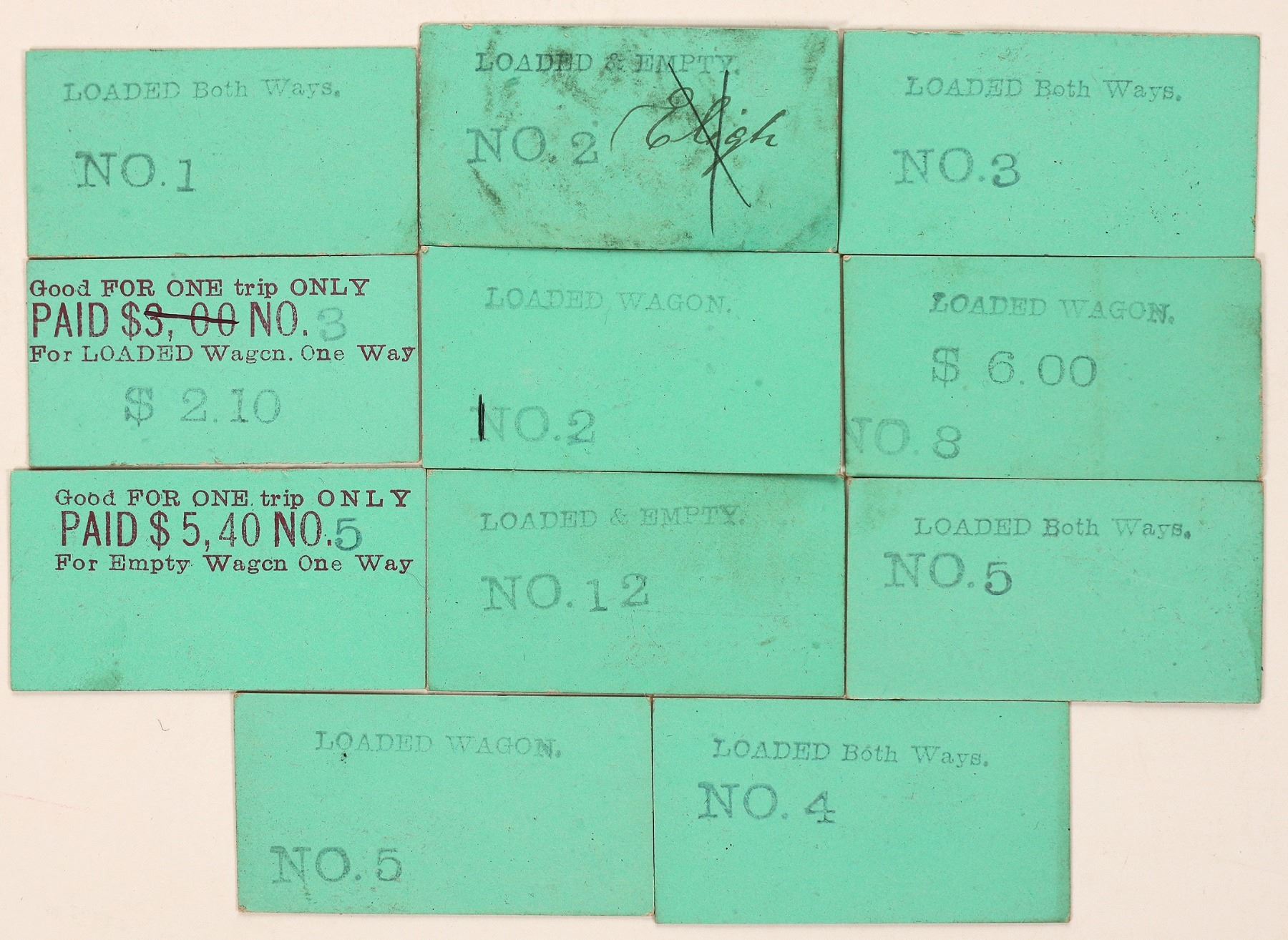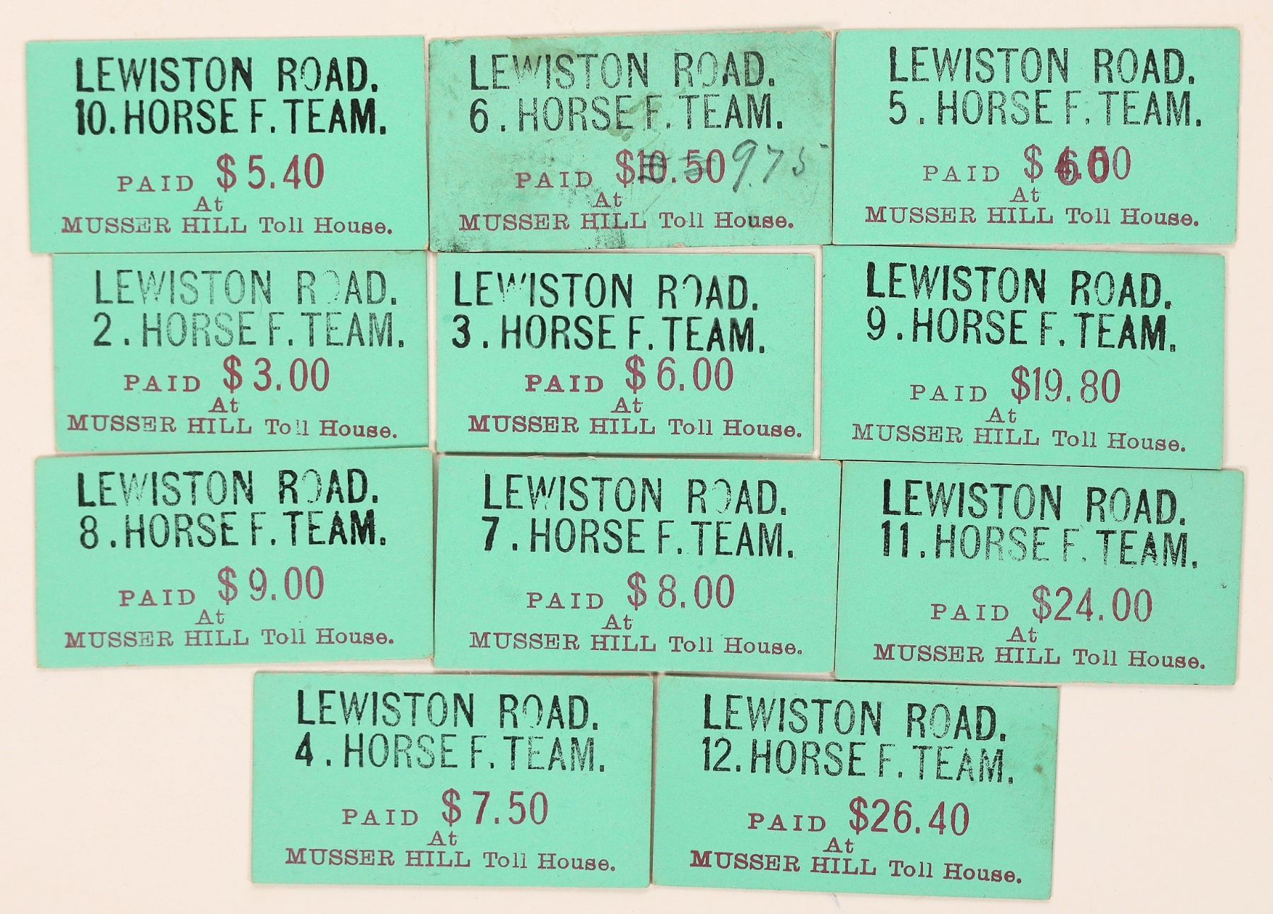 Lot of 11: Green Tickets. Lewiston Road and Musser Hill Toll House. Good Condition. Horse Team. (11) from $3-$20.