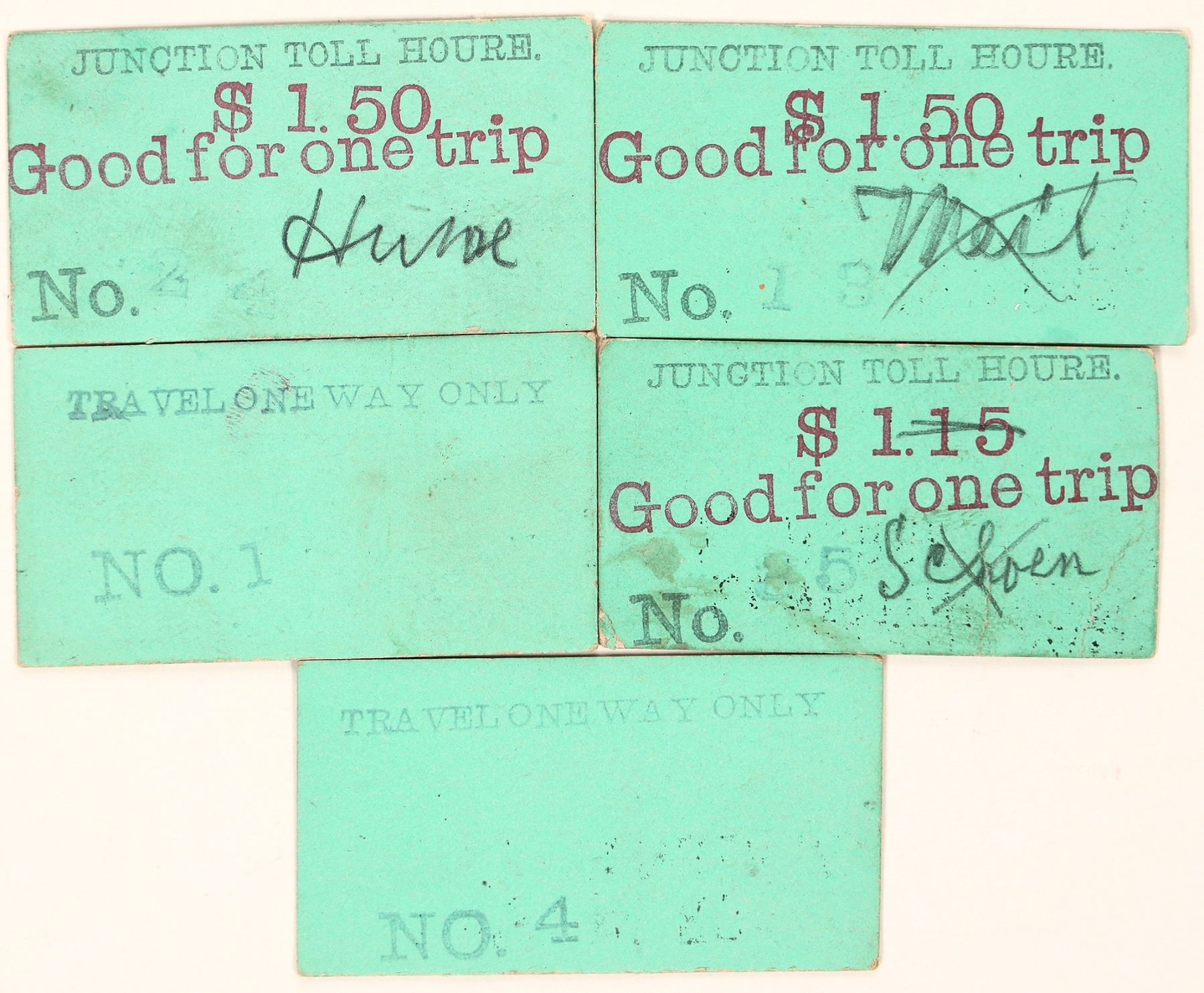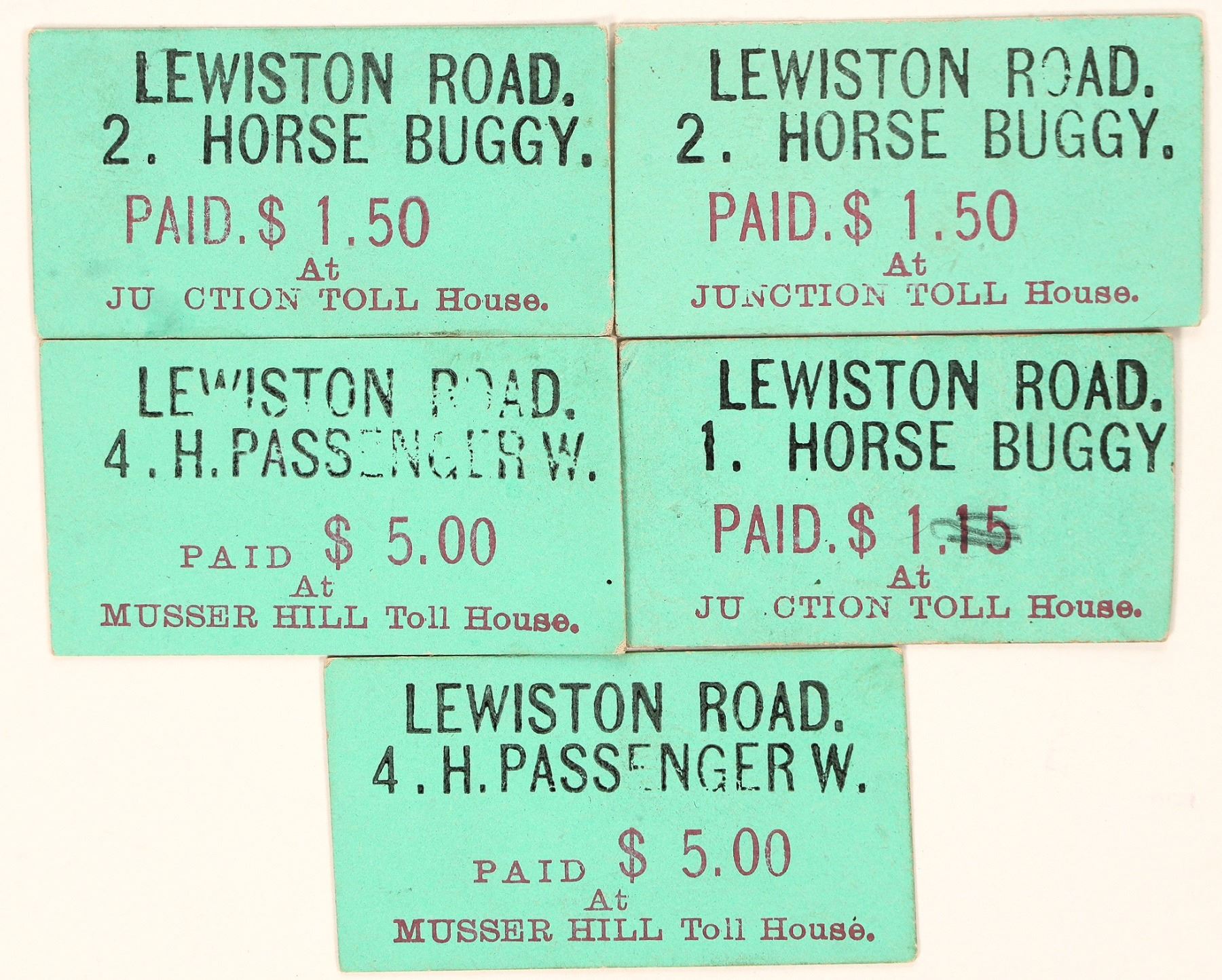 Lot of 5 Green Tickets. Good Condition. Musser Hill Toll House and Lewiston Toad. CA Horse and Buggy Passenger,