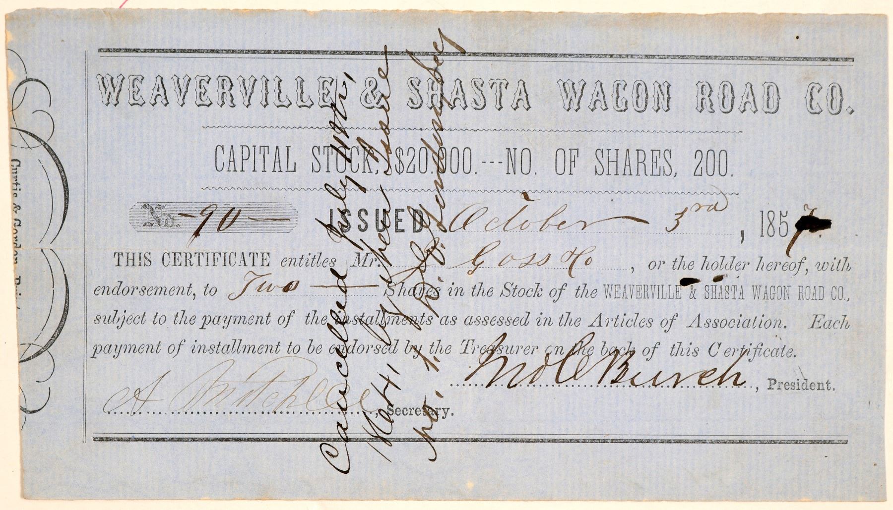 Rare Gold Rush. Usually unissued. This is No. 90, issued for two shares to J. Goss & Co. on Oct. 3rd, 1857. Signed by president Burch and secretary A. McPhee. Pen cancelled. Black print on blue paper. 4 x 7.25" Cut unevenly on left. Folds, some toning. Signed on the back by the treasurer. The company built and operated a toll road in the Trinity Mountains in North California. The road was surfaced with planks. The company is one of the earliest California turnpike companies. William Lowden formed the Weaverville and Shasta Wagon Road in 1857 to provide upgraded thoroughfare over Trinity and Brown's Mountains.