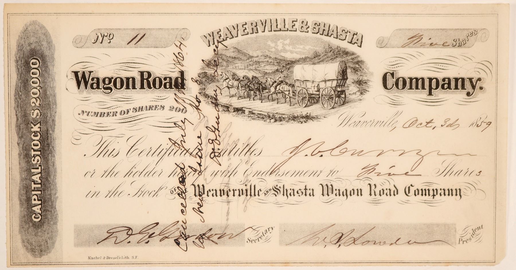 Rare issued 1950's Wagon Road Stock certificate. # 11 for 5 shares to (?). Signed by secretary Gruden and president William S Snowden! Pen cancelled 1864 for a new issue. Black print with very simple border and vignette top center of horse drawn wagon on trail. Kuchel & Dresels Lith. William S. Lowden controlled the Weaverville & Shasta Wagon Road (also the Lewiston Toll Road, and at one time had a large interest in the Weaverville & Minersville Toll Road) is an example of an entrepreneurial spirit. A student of Lowden's toll empire wrote: "Lowden was not a dreamer, desiring to make his fortune by direct working of the gold fields. Instead, he [realized]... at an early age that a large, sure fortune could be made by providing services for the gold fields" (Cage 1984, 45). Lowden's enterprises enjoyed some flush days, but over forty-two years averaged very modest returns. Ken Prag Collection