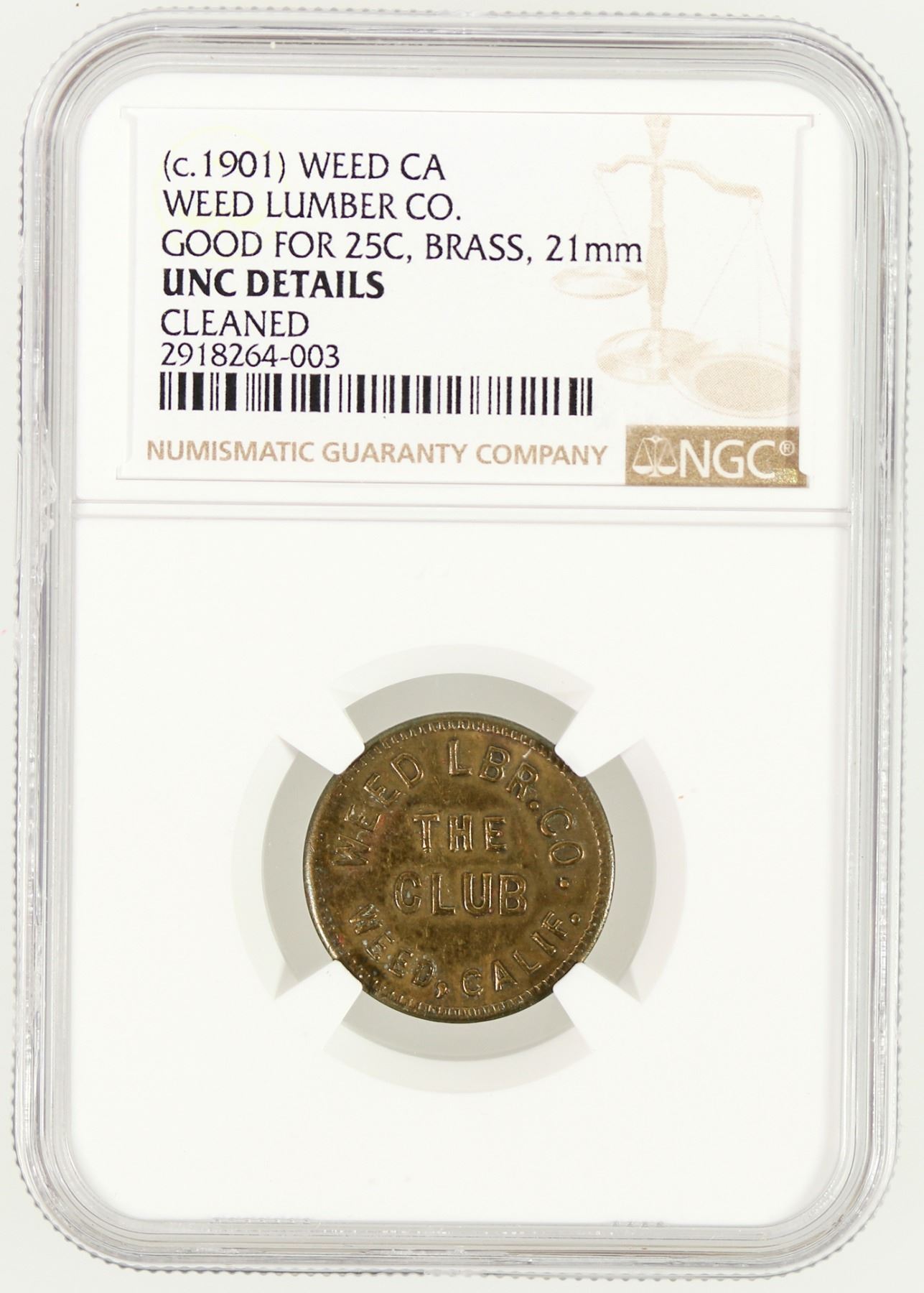 NGC certified UNC Details, cleaned. WEED LBR. CO. / THE / CLUB / WEED, CALIF. // GOOD FOR / 25c / IN / RETAIL TRADE; br., rd., 21 mm.