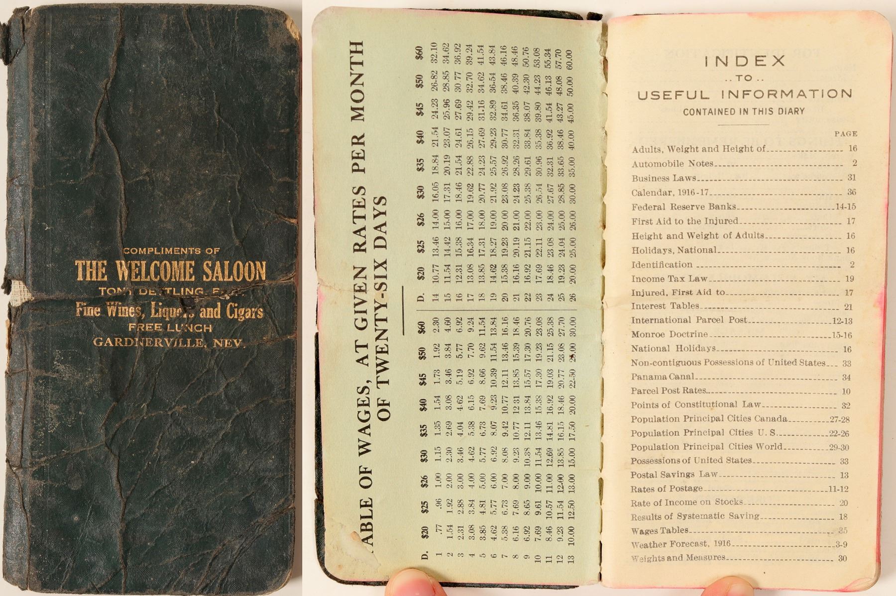 "Compliments of / The Welcome Saloon / Tony Dettling, Prop. / Fine Wines, Liquors and Cigars / Free Lunch / Gardnerville, Nev. In addition to the daily diary for 1916, this 3 x 6 inch volume is full of useful information: weather almanac for 1916, synopsis of the Income Tax Law of 1913 (the first federal income tax), populations for major cities, charts for monthly savings, the new Federal Reserve Banking Law, the United States Postal Savings Bank, an entire world atlas!