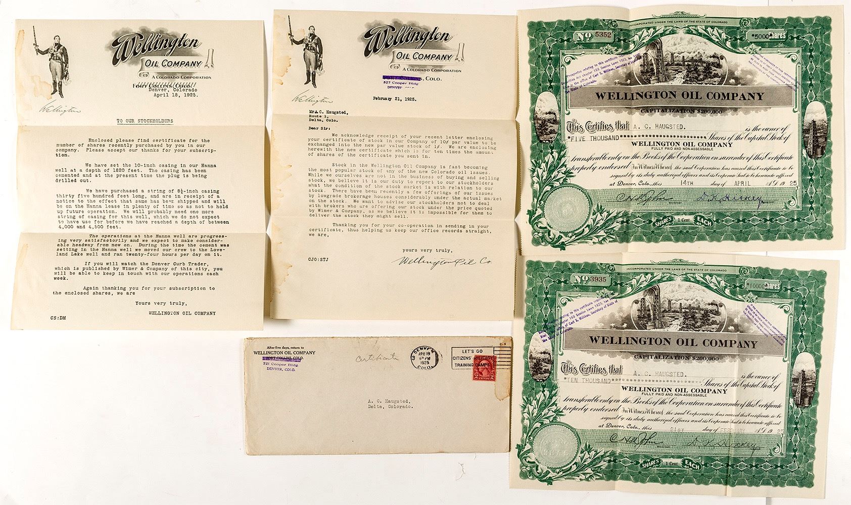 Lot of five. Circa 1925. Stock certificates number 3935 and 5352. Two letterhead with a fancy Napoleonic type soldier holding his sword aloft. One corner cover envelope. All from A. C. Haugsted of Delta, Colorado. Date: Location: Denver, Colorado HWAC # 45042