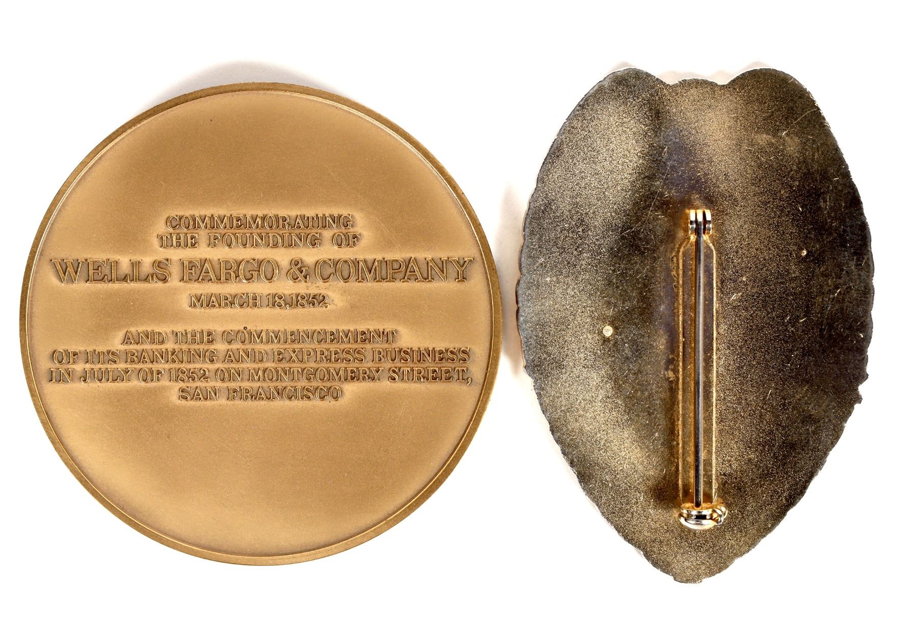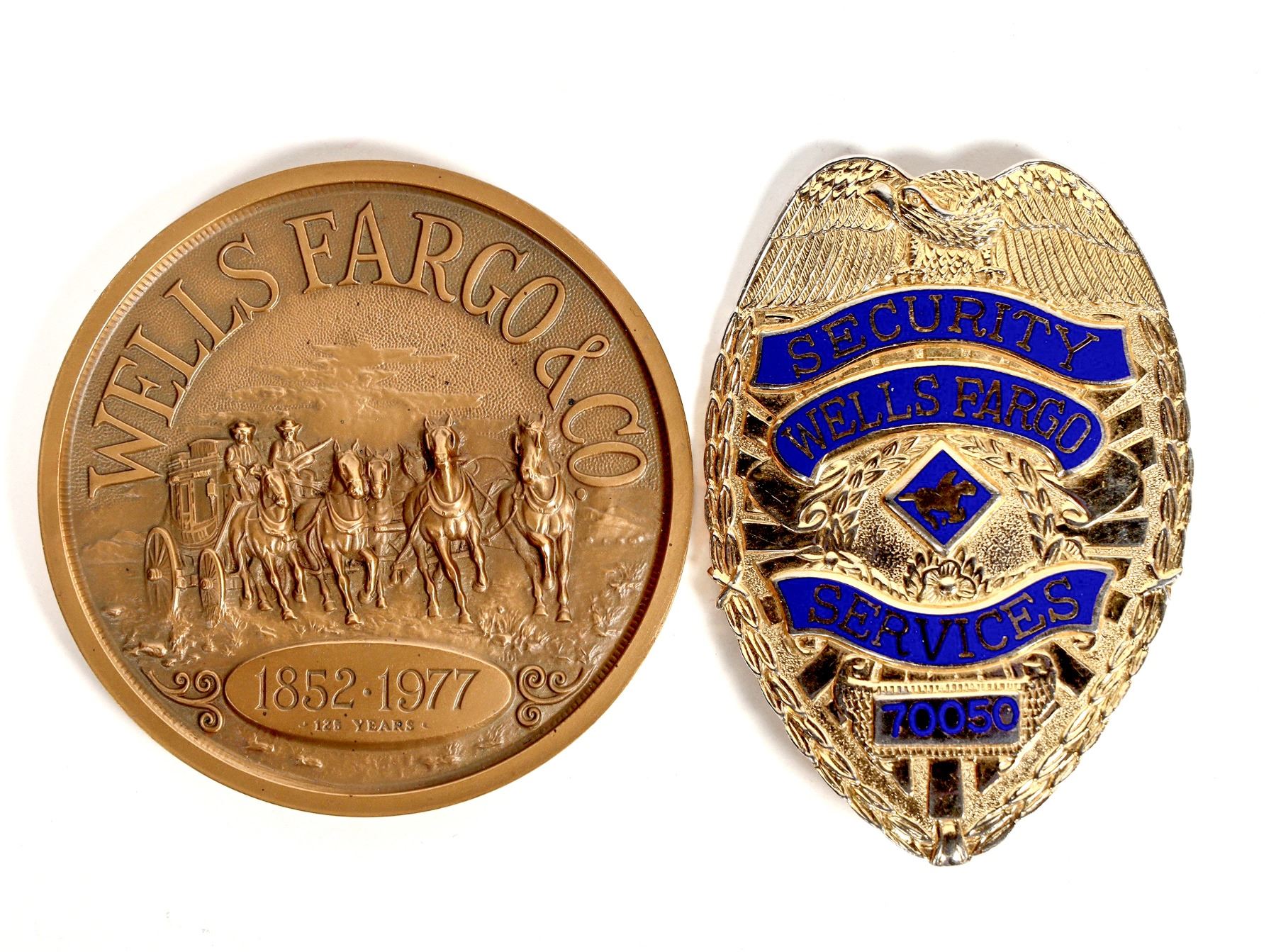 Wells Fargo 125th Anniversary Medal & Security Badge. First is a 3" Bronze Medal in its original presentation box. It reads "Compliments of Wells Fargo Bank in Commemoration of our 125th Anniversary 1852-1977." An accompanying information folder states Your Medallion has been distributed only as a gift and is one of 2,200 struck in honor of Wells Fargo's 125th anniversary. The dies used have been destroyed to protect this special memento's uniqueness. However, the edge of the medal is engraved "2250 Minted." It was given out to officers and select employees of the bank, and certain dignitaries. Also is an authentic obsolete pre-1967 badge from the Wells Fargo Security Services. This division of Wells Fargo & Co. was sold in 1967 and evolved into Loomis Fargo & Co. and is now part of the Swedish company Securitas AB. Douglas McDonald Collection.
