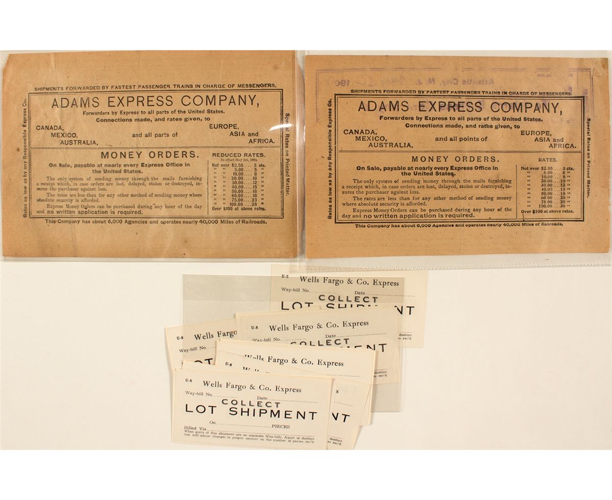 1) Rare sixteen unused Wells Fargo & Co. Express adhesive shipment labels. Post-1900. 2) Two bills of lading for the Adams Express Company. One is datelined Atlantic City, New Jersey, June 2, 1908. Marked Troy Laundry Co. in Philadelphia. Second was issued in New York on Feb 2, 1907. Has blue 1 cent series of 1898 stamp attached upper right.