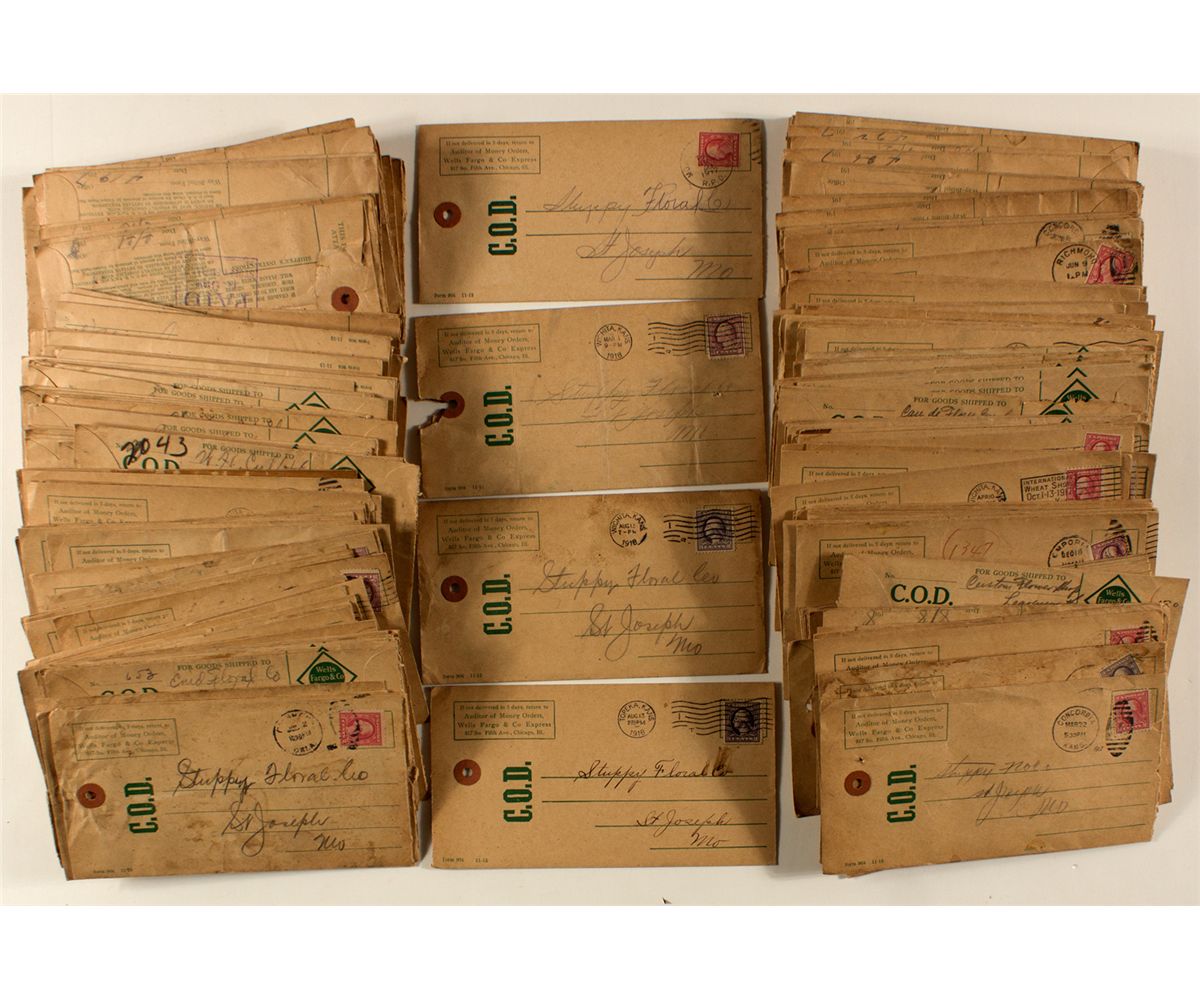 About 225 Wells Fargo Express COD envelopes. All postal cancelled from the southern mid-West. This variety has the logo on the back. Prag Collection.