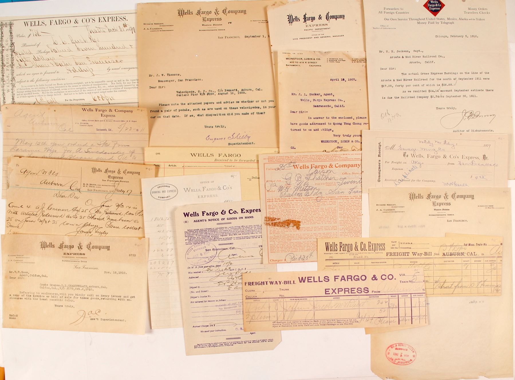 Lot of 15. Best two pieces are an 1870 receipt for a sealed package (worth $750) mailed from Shasta to San Francisco; and an 1879 Virginia City, Nevada consignee receipt for packages for the Savage Mining Co. Other documents include: 1) Letterheads: Chicago, 1912 to Arcata & Mad River RR; San Francisco, 1909, 1910, and 1911. 2) Freight way-bills: Auburn 1907 and 1911. 3) Messages to Auburn 1911 and 1914, and San Francisco 1910. 4) 1913 Express receipt from Carson City. And more. Please inspect. (Potter Collection) City: State: California Date: