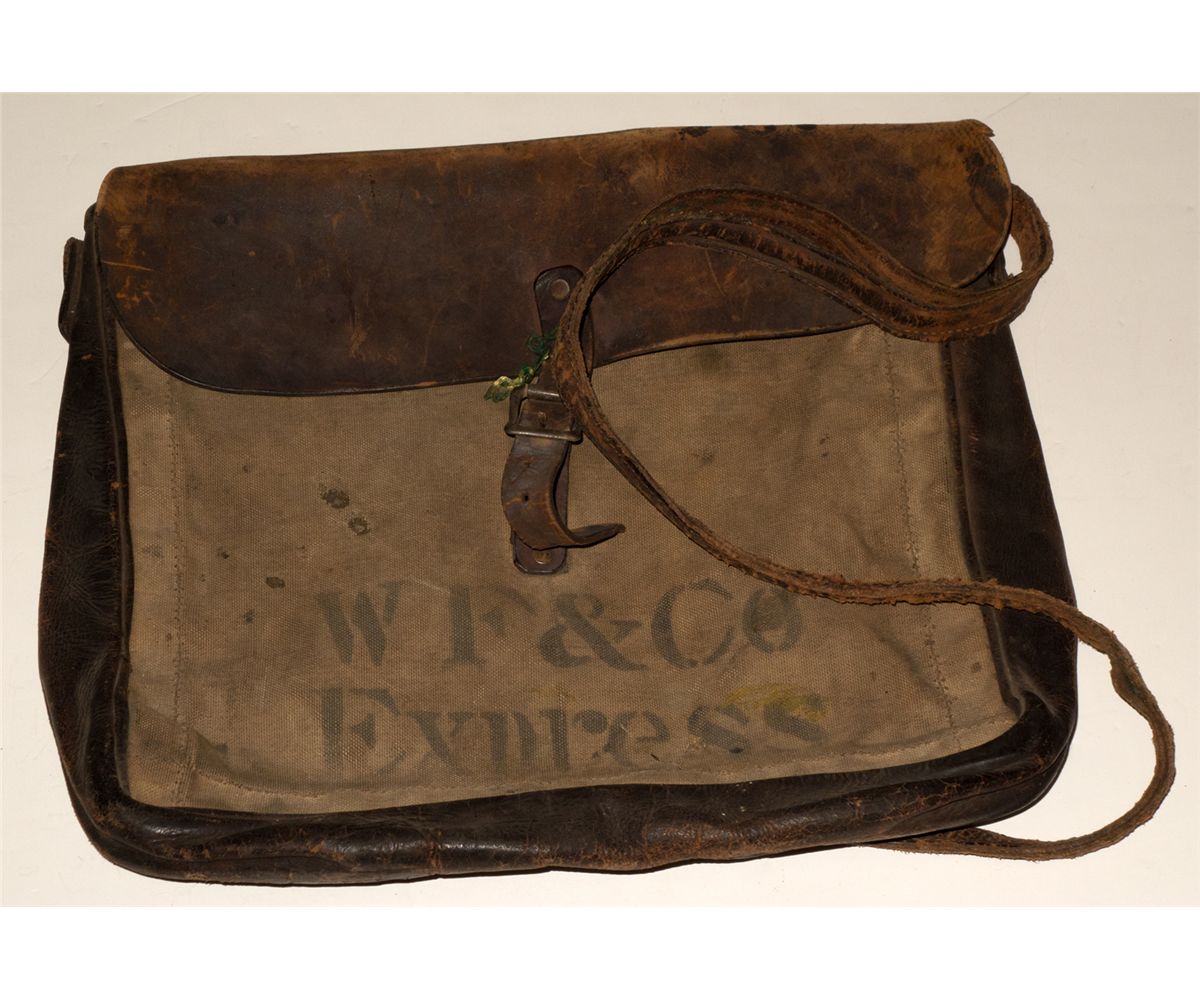 14" x 16". Mail bag. Stamped, "WF& Co. / Express." Leather and canvas. Over the shoulder strap. The piece is in good condition,