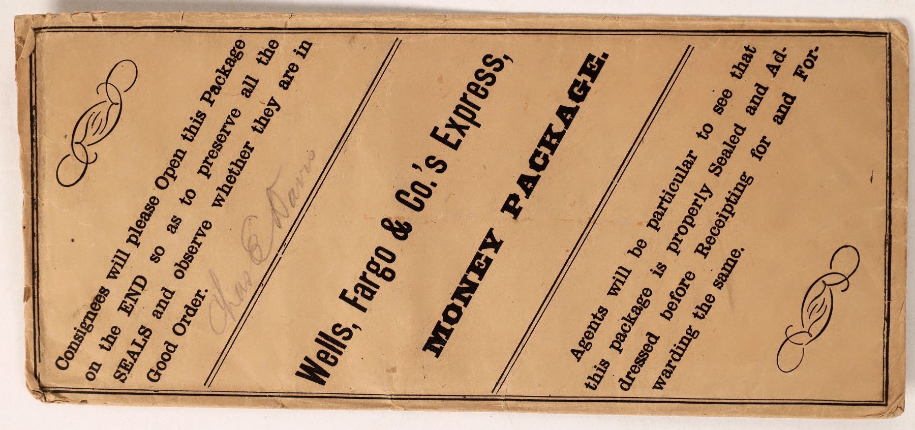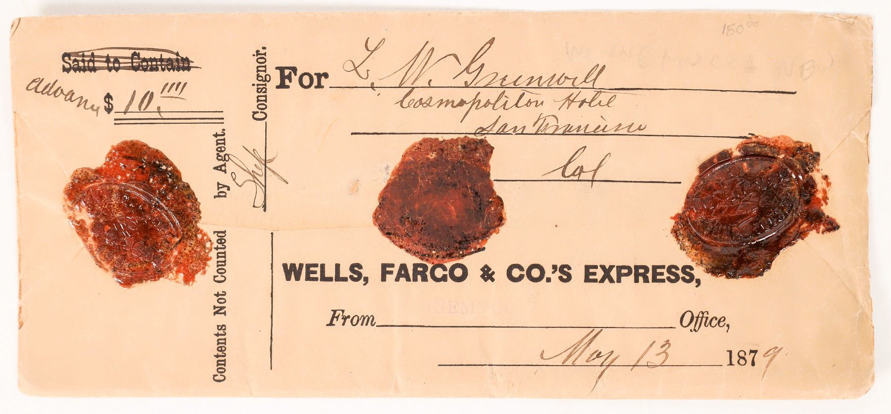Wells, Fargo & Co.'s Express Money Package: "Consignees will please open this package on the END so as to preserve all the SEALS and observe whether they are in Good Order". This May 13, 1879 envelope for L. W. Griswill, Cosmopolitan Hotel, San Francisco has all three seals in tact.