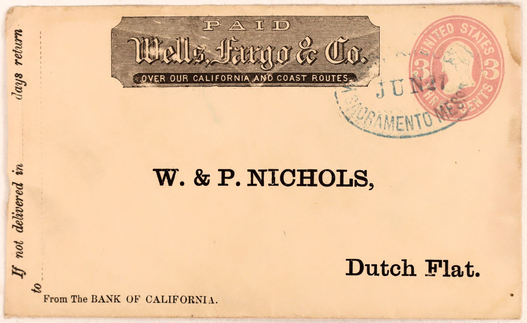 Preprinted Wells, Fargo & Co. cover addressed to W. & P. Nicholls, Dutch Flat Size: 5.25 x 3.25 inches. See our philatelic section for other Wells Fargo & Co. Express items. Dutch Flat California